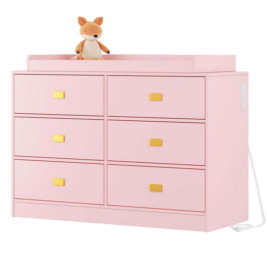 GAOMON Dresser for Bedroom with 6 Drawers, Changing Table Dresser with Changing Table Top, Nursery Dresser Diaper Changing Station for Baby with Power Outlets, Changing Pad & Removable Top, Pink