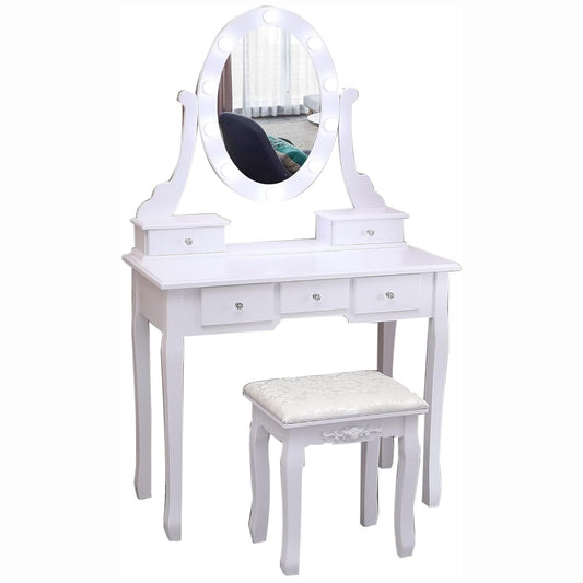 GAOMON Vanity Desk with Mirror and Lights, Wood Makeup Dressing Table with Oval Mirror & Stool,3 Colors Lighting Modes,Modern Bedroom Dressing Table with 5 Large Drawers for Kids Women Girls,White