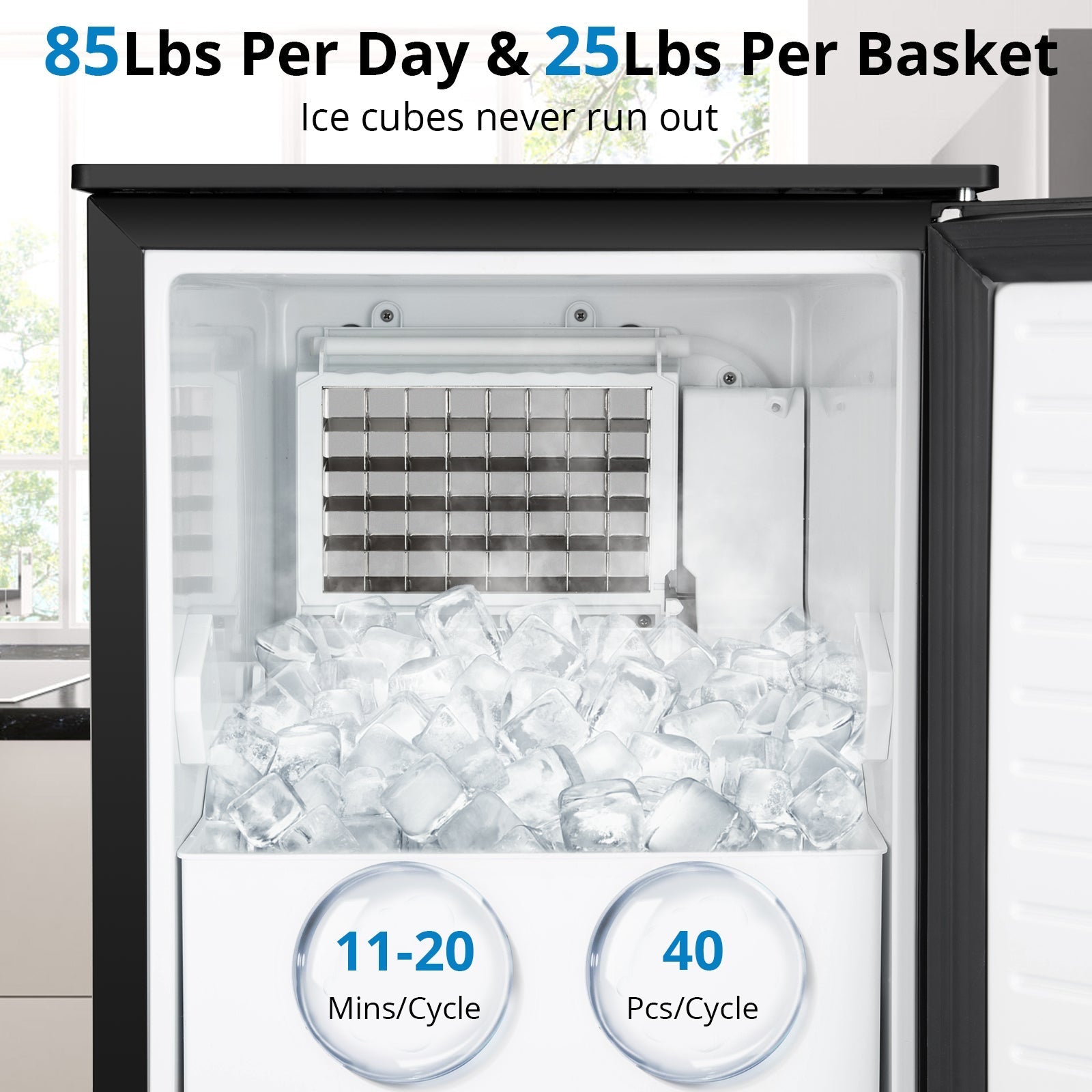 The ice maker machine can produce 85 lbs of square ice cubes in 24 hours, and the ice storage bin can hold 25 pounds of ice at one time. Each round 40 pcs of ice cubes are made in 5-15 minutes depending on the setting, very fast ice making. Each ice cube of the commercial ice maker machine is at the standard size of 0.9"x0.9"x0.9", but the ice cube thickness can be adjusted by adding or reducing ice making time, so you can get any thickness you desire for different occassions.