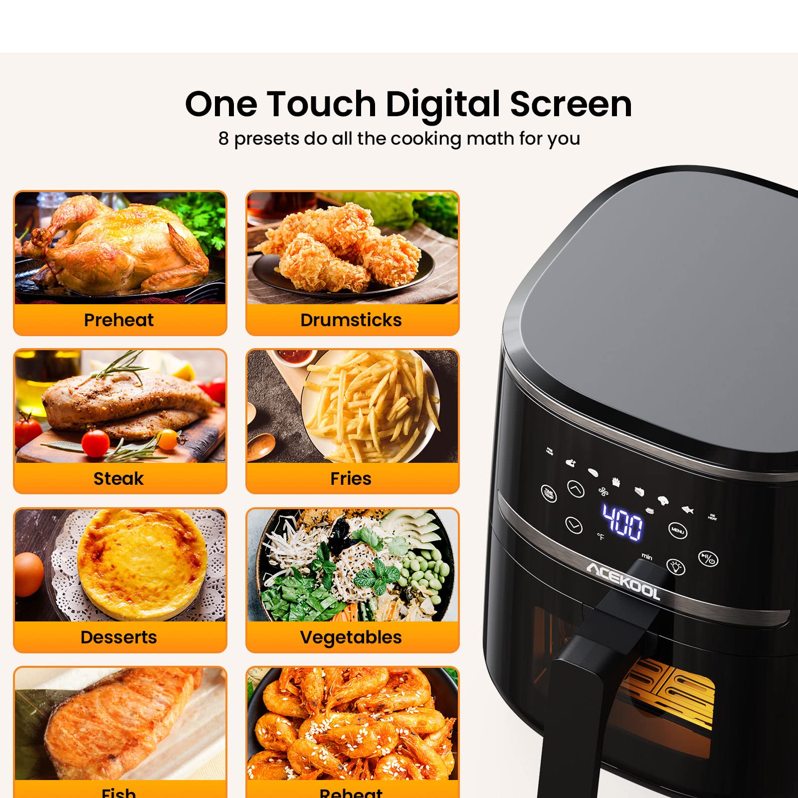 - The air fryer allows you easily check the cooking time and temperature at a glance. Quick start with one-touch presets or customize the temperature and time according to personal taste.