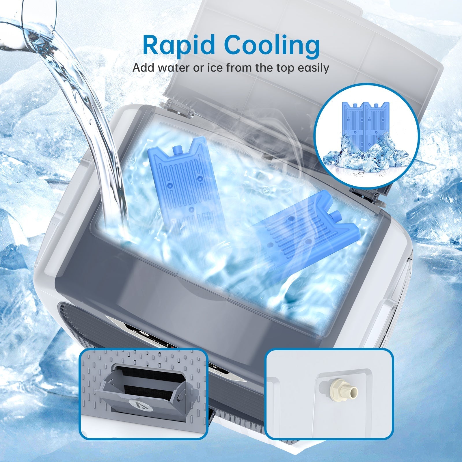 Adding water from the top or add into the 10.5 Gallons water tank manually,large enough for max 4 hours cooling. Or you can use the continuous fill option by attaching a standard garden hose with the included water pipe