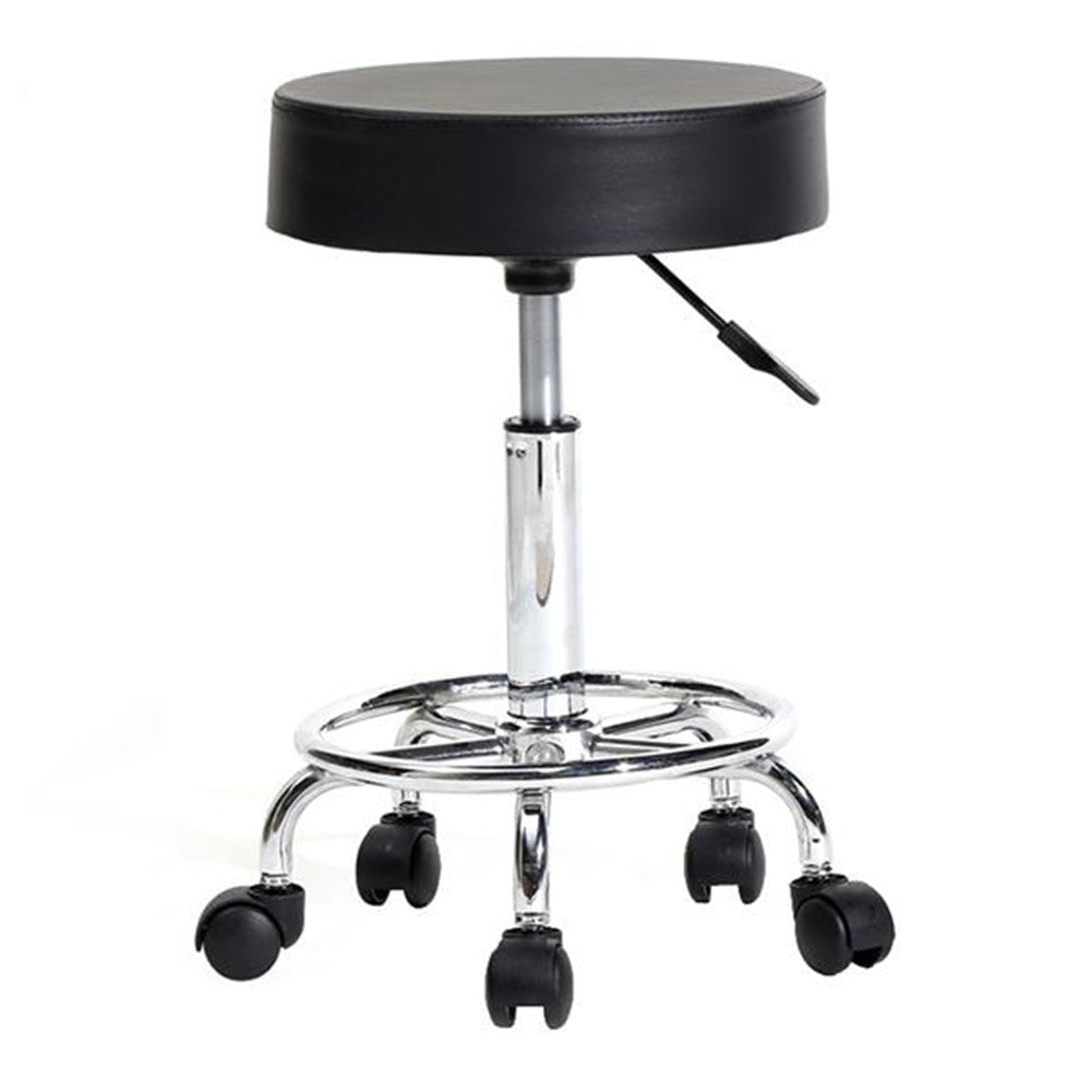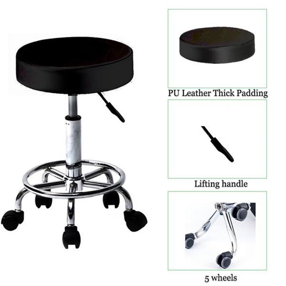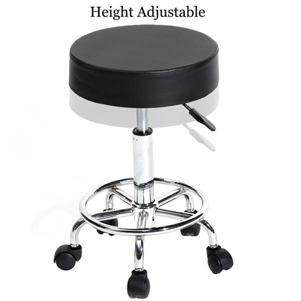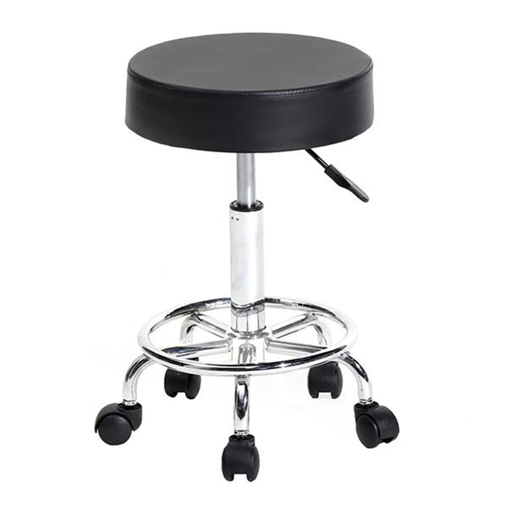 It is made of high quality PU leather and stainless steel, with a cushion filled with sponge, durable and soft for you to sit on. It has five casters, can rotate 360 ??degrees, very convenient. Adjustable height. Waterproof and soft.suitable for many places.