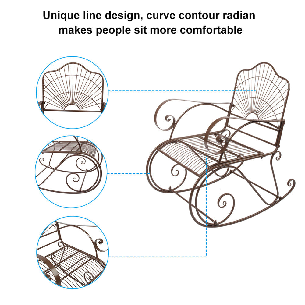 '--Designed to complement your patio, porch, lawn or garden and add a unique look to your decor--Made of solid wrought iron, this product is durable enough to ensure you can enjoy this chair for years to come--You can easily move the rocking chair--Add cushions or pillows to this chair for maximum comfort--Match your existing patio design--Overall size: (22.05 x 34.64 x 38.38)" / (56.01 x 87.99 x 97.49)cm (L x W x H)
