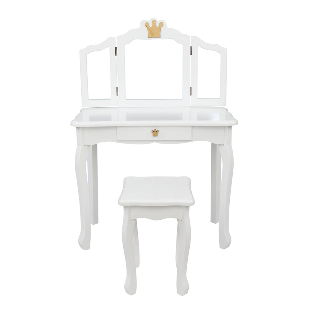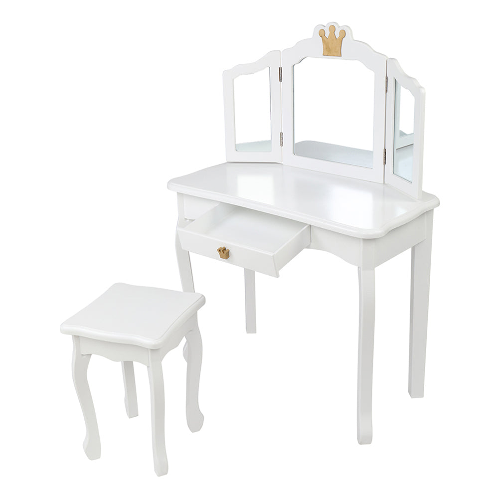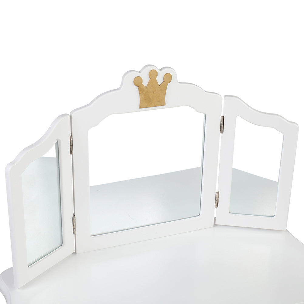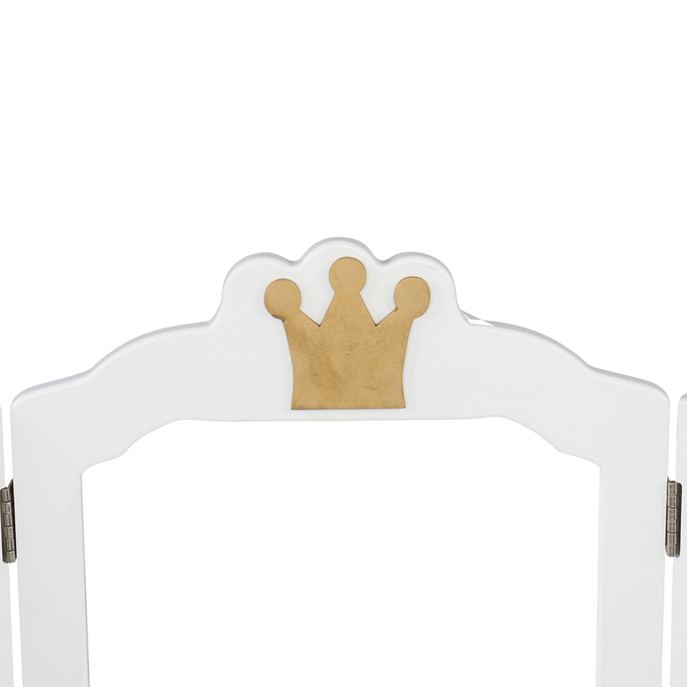 '--Made of high quality MDF board, which accentuates the super quality of the dressing table.--White crown style make this dresser sweet and lovely.--The dresser top and stool surface all adopt arc design for avoid children knock against to cause unnecessary injury.--The three-fold mirror can be detachable and used as a children's desk.--Size: Dressing Table: (27.48 x 13.54 x 42.13)" / (69.8 x 34.4 x 107)cm(L x W x H), Stool: (10.63 x 10.63 x 14.57)" / (27 x 27 x 37)cmcm(L x W x H)