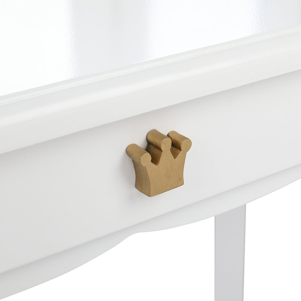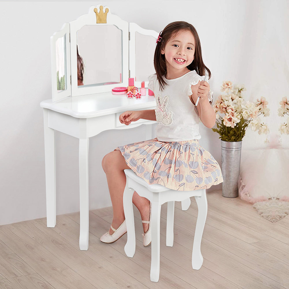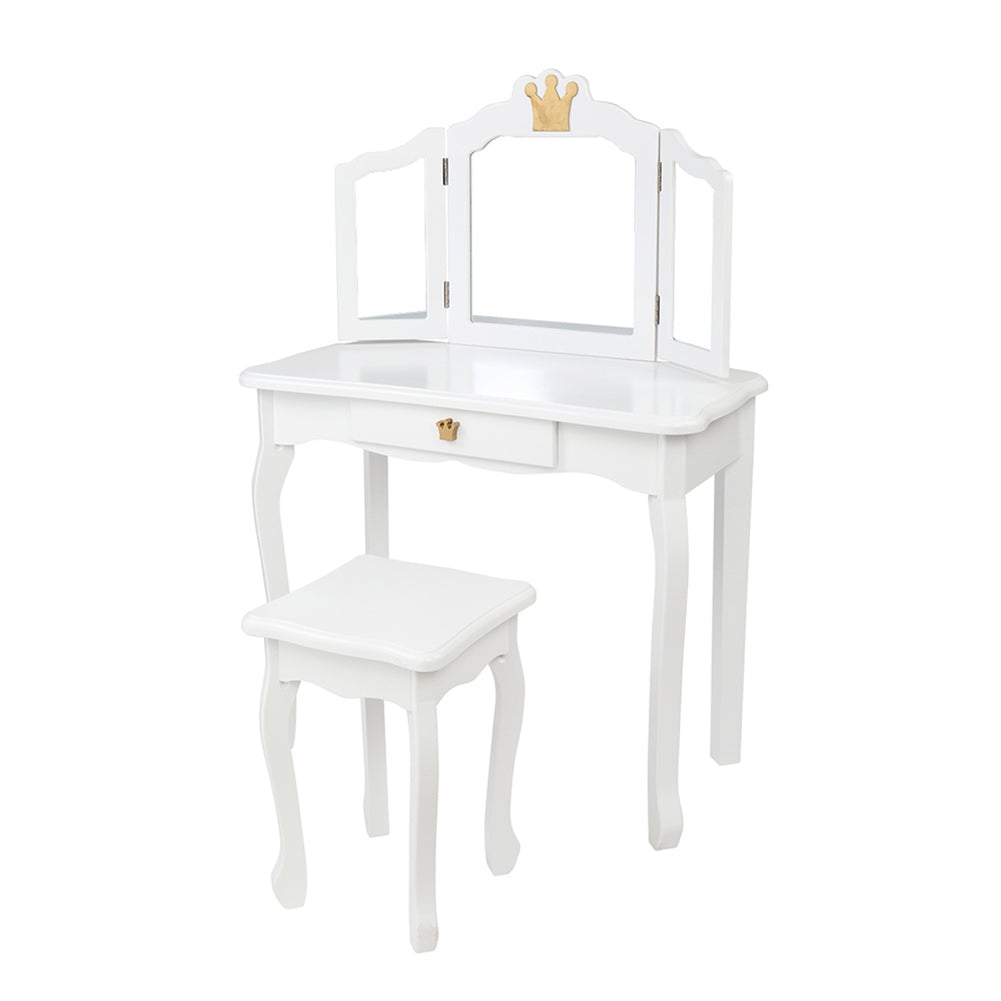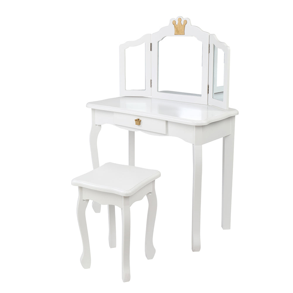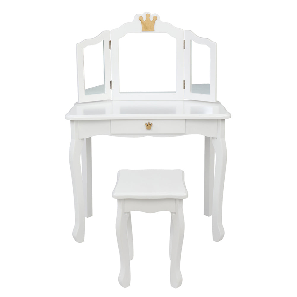 '--Made of high quality MDF board, which accentuates the super quality of the dressing table.--White crown style make this dresser sweet and lovely.--The dresser top and stool surface all adopt arc design for avoid children knock against to cause unnecessary injury.--The three-fold mirror can be detachable and used as a children's desk.--Size: Dressing Table: (27.48 x 13.54 x 42.13)" / (69.8 x 34.4 x 107)cm(L x W x H), Stool: (10.63 x 10.63 x 14.57)" / (27 x 27 x 37)cmcm(L x W x H)