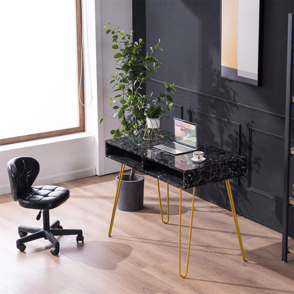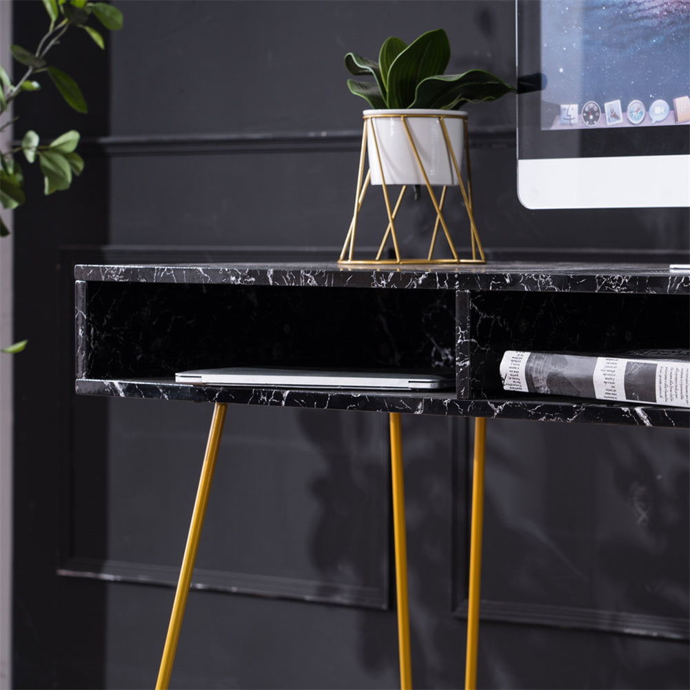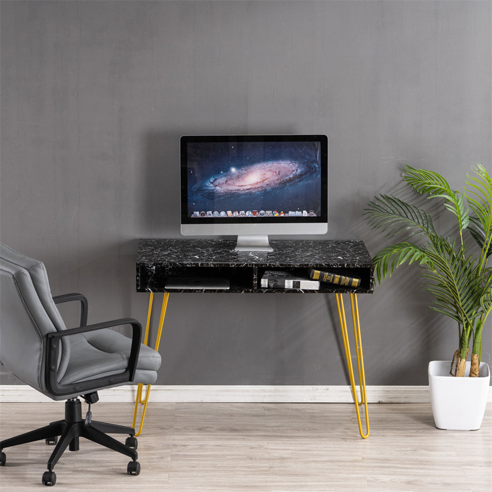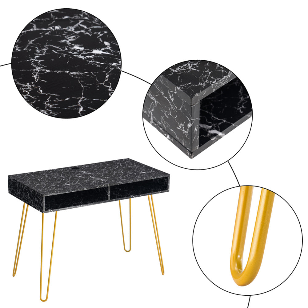 '--Made of MDF laminated particleboard with powder coated metal legs, faux black marble finish paired with golden hairpin legs for easy cleaning and updated look.--The desktop is pre-assembled and spacious enough to hold your laptop and office supplies.--2 open compartments allow you to keep your notebook and papers within easy reach of your workspace.--The long open cubby behind the desk is the perfect hiding place for a power strip.--Cords keep your cords organized and tangle-free.