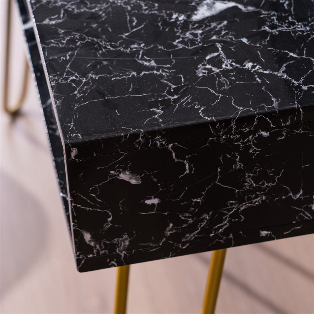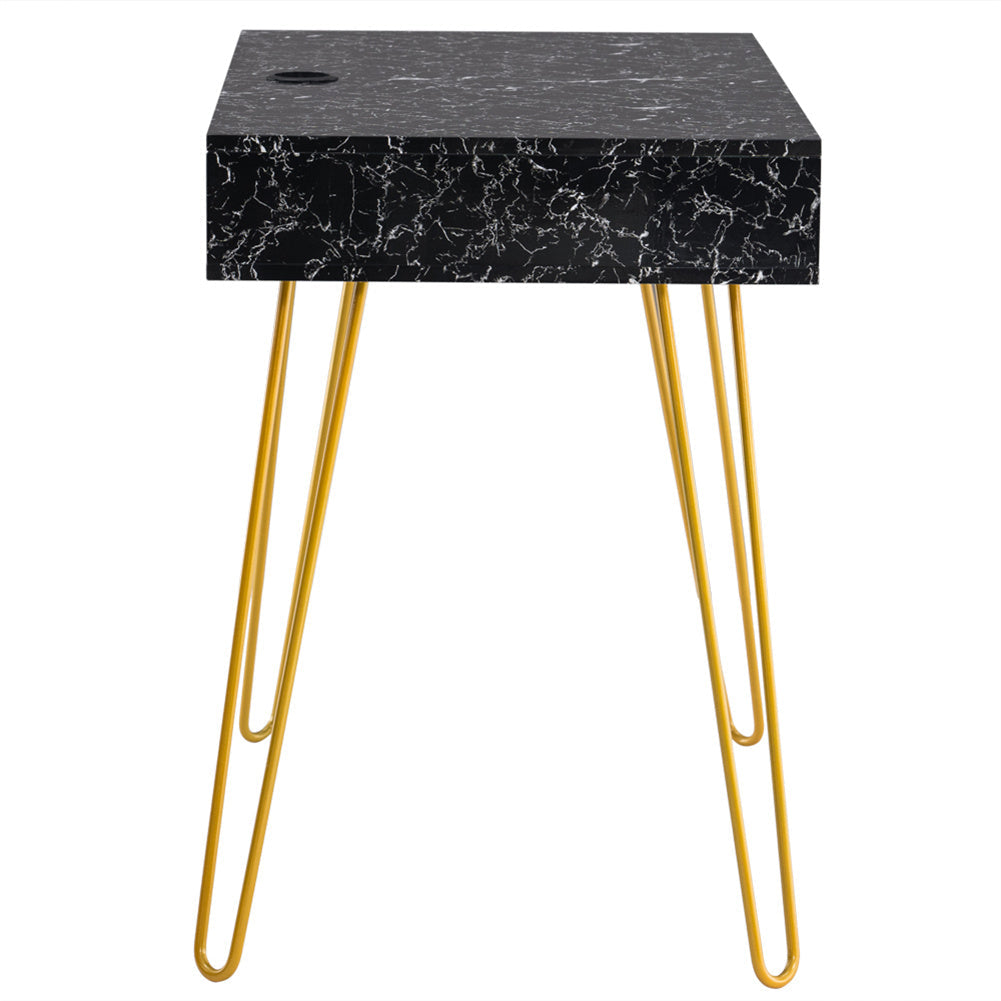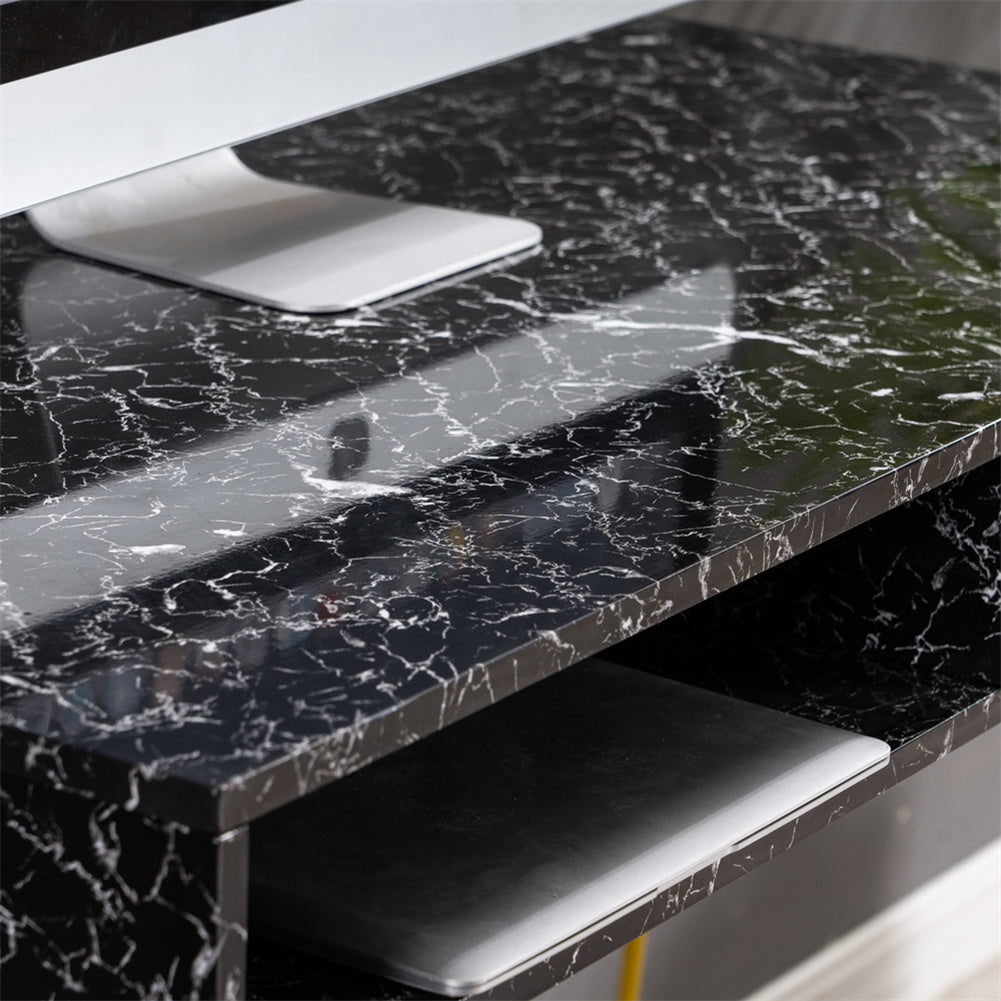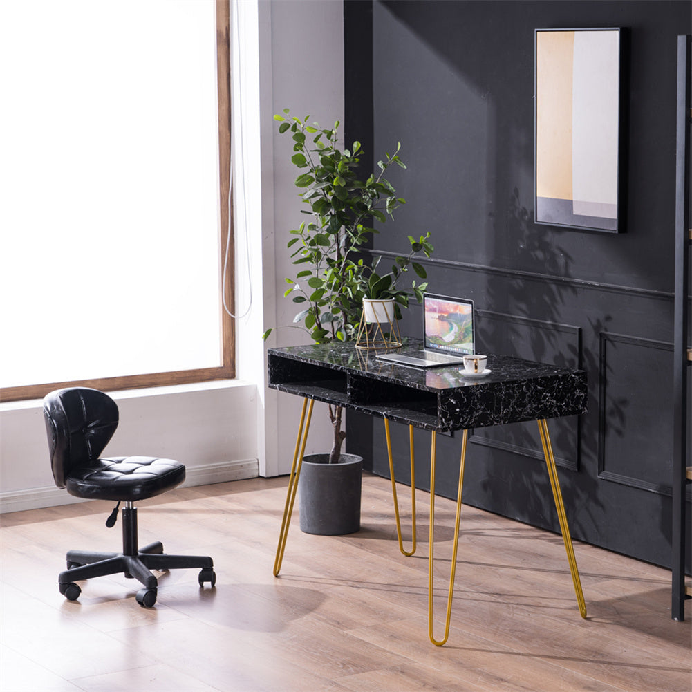 '--Made of MDF laminated particleboard with powder coated metal legs, faux black marble finish paired with golden hairpin legs for easy cleaning and updated look.--The desktop is pre-assembled and spacious enough to hold your laptop and office supplies.--2 open compartments allow you to keep your notebook and papers within easy reach of your workspace.--The long open cubby behind the desk is the perfect hiding place for a power strip.--Cords keep your cords organized and tangle-free.