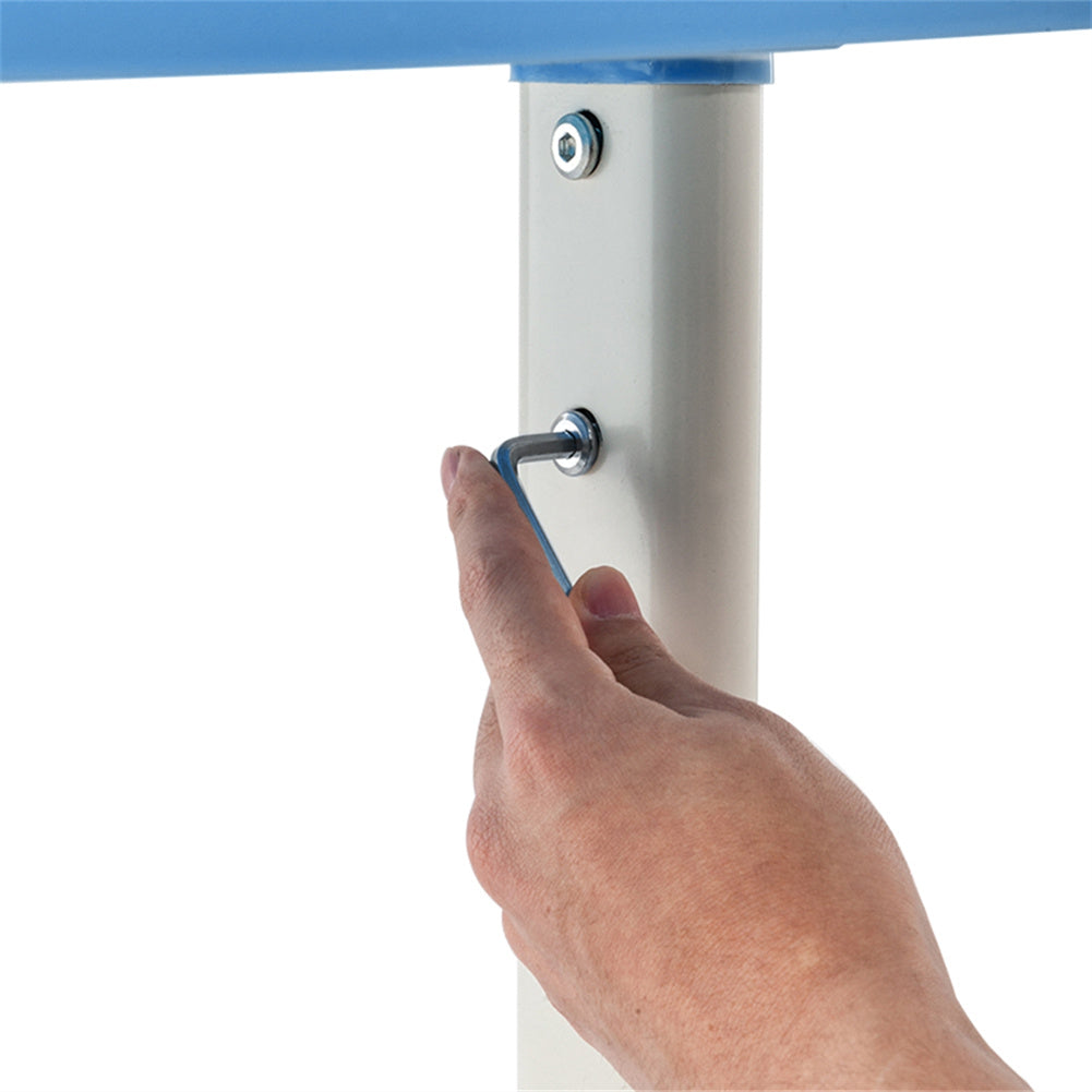 The appropriate height of tables and chairs is especially important for children, especially during their formative periods. This children's learning kit will provide a more comfortable learning environment for your child. The desktop and chairs are adjustable in height and can easily accommodate children of any age (3-14 years old). Desktop size is 60x40cm, suitable for writing, drawing, etc. The desktop has a separate pen slot, you can place a pencil or eraser. There is a hook on both sides of the table that can hang a backpack or water bottle. The seat and backrest of the chair are made of plastic for easy movement of children. This product is made of high quality metal and density plate, as well as plastic, durable and long service life. Vibrant blue embellishment allows your child to integrate more quickly into the learning atmosphere.
