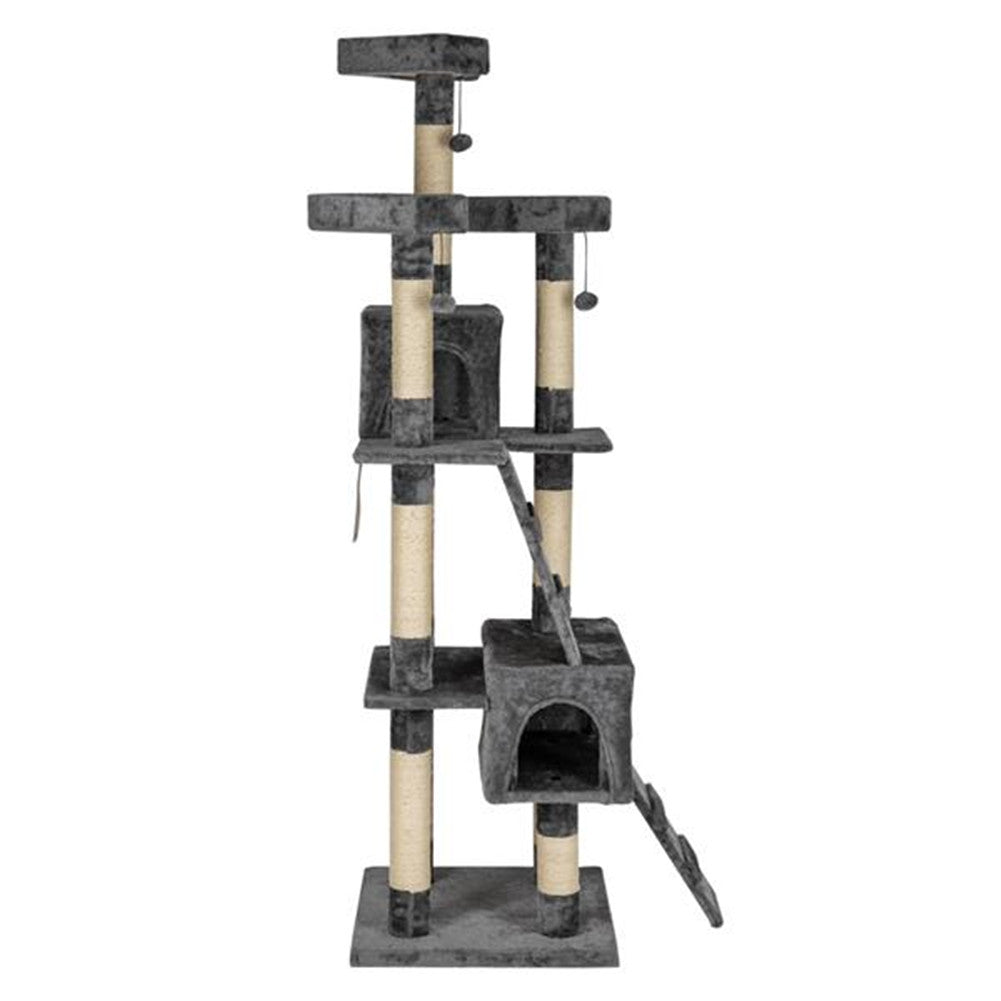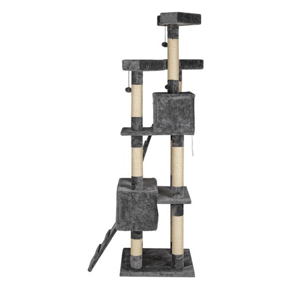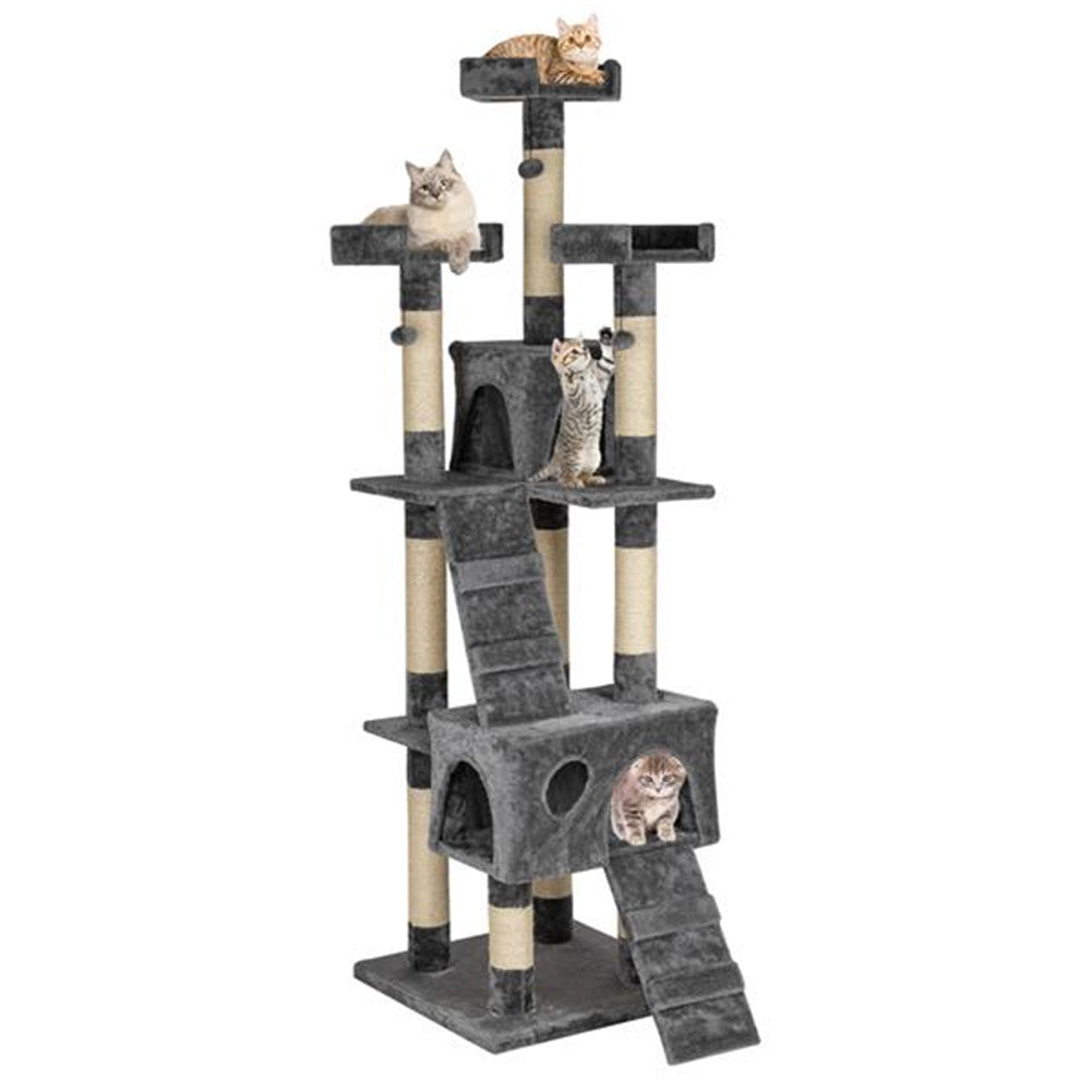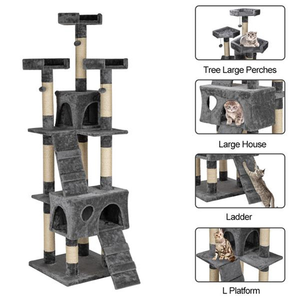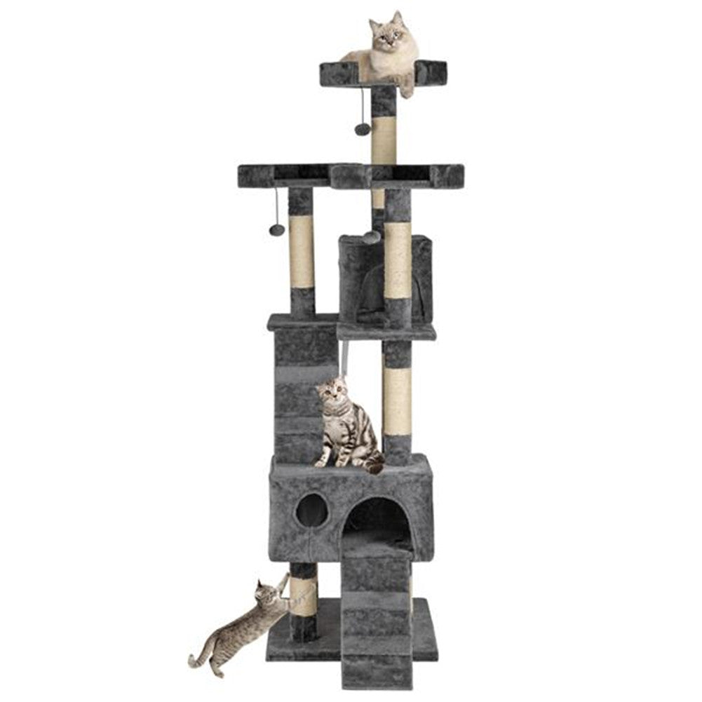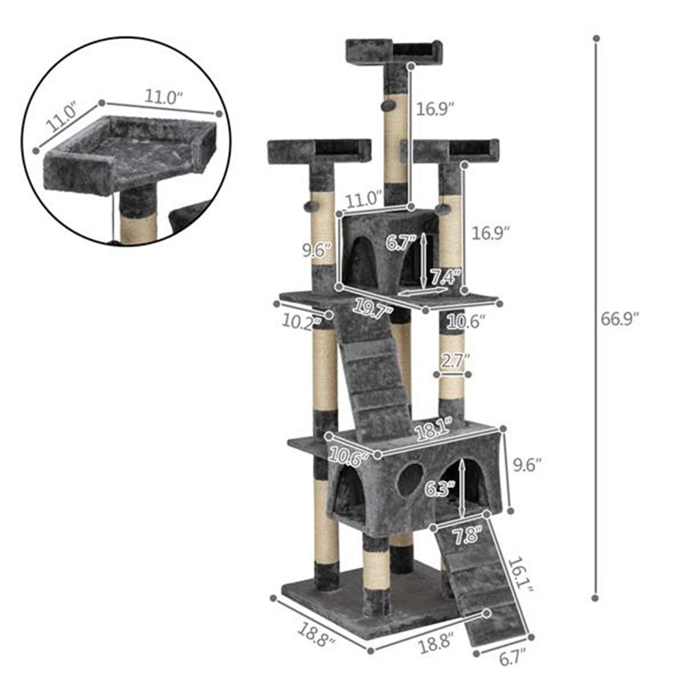 Are you searching for a toy to your lovely cat? This 66" Sisal Hemp Cat Tree Tower is highly recommended to you. It's made of plush fabric, sisal rope, particleboard, which is sturdy, concise and environmentally friendly.2 spacious hideaway houses offer super soft and warm lounging spots, sisal rope coiled posts help develop positive scratching habit, 3 top perches platform to enjoy the feeling of being at the top of the world and sit on to look out the window, multi-layer tower meets the climbing nature of kittens. With this cat condo, your kitty could enjoy all day on this tree.Just buy it for your beloved cat!
