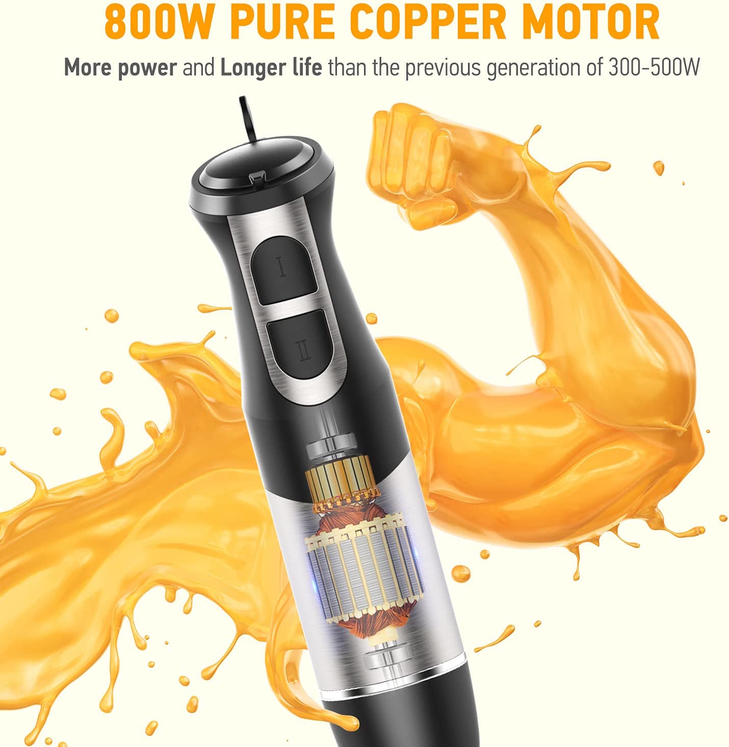 '--FUNAVO 5 in 1 Versatile Immersion Hand Blender--Powerful 800W motor offer strong extremely energy for mixing and chopping.--All food-contact components are made of food-grade BPA-free materials.--Bell-shaped blades guard prevents splashing and stuck to keep your kitchen tidy.--12 levels adjustable speed design and 5 attachments offer different complementary foods for baby.--5 attachments are dishwasher safe except blender body with motor.