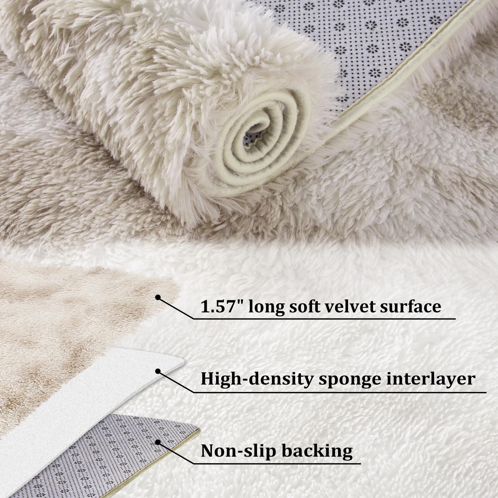 Our fluffy area rug features a top layer of soft velvet material, with an upgrade sponge interlayer that brings you softness feeling like stepping out onto a cloud and shields your toes from the cold floor, and spot-molded base grips the floor firmly to prevent slippage and is resistant to wear and tear.