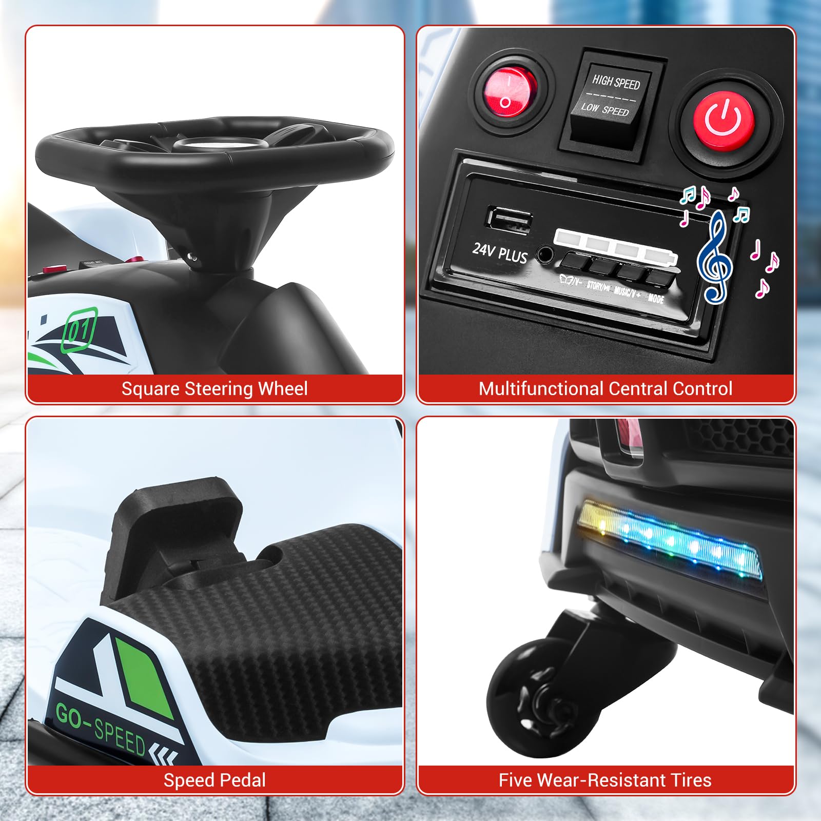 GAOMON 24V Ride On Drift Car for Kids,7Ah Battery 180W Brushless Quieter Motor Electric Drifting Go-Kart for Rider Up to 110 Lbs, With Music,Front+Tail Led Light,Low-Power Alarm for 8+ Toy , White