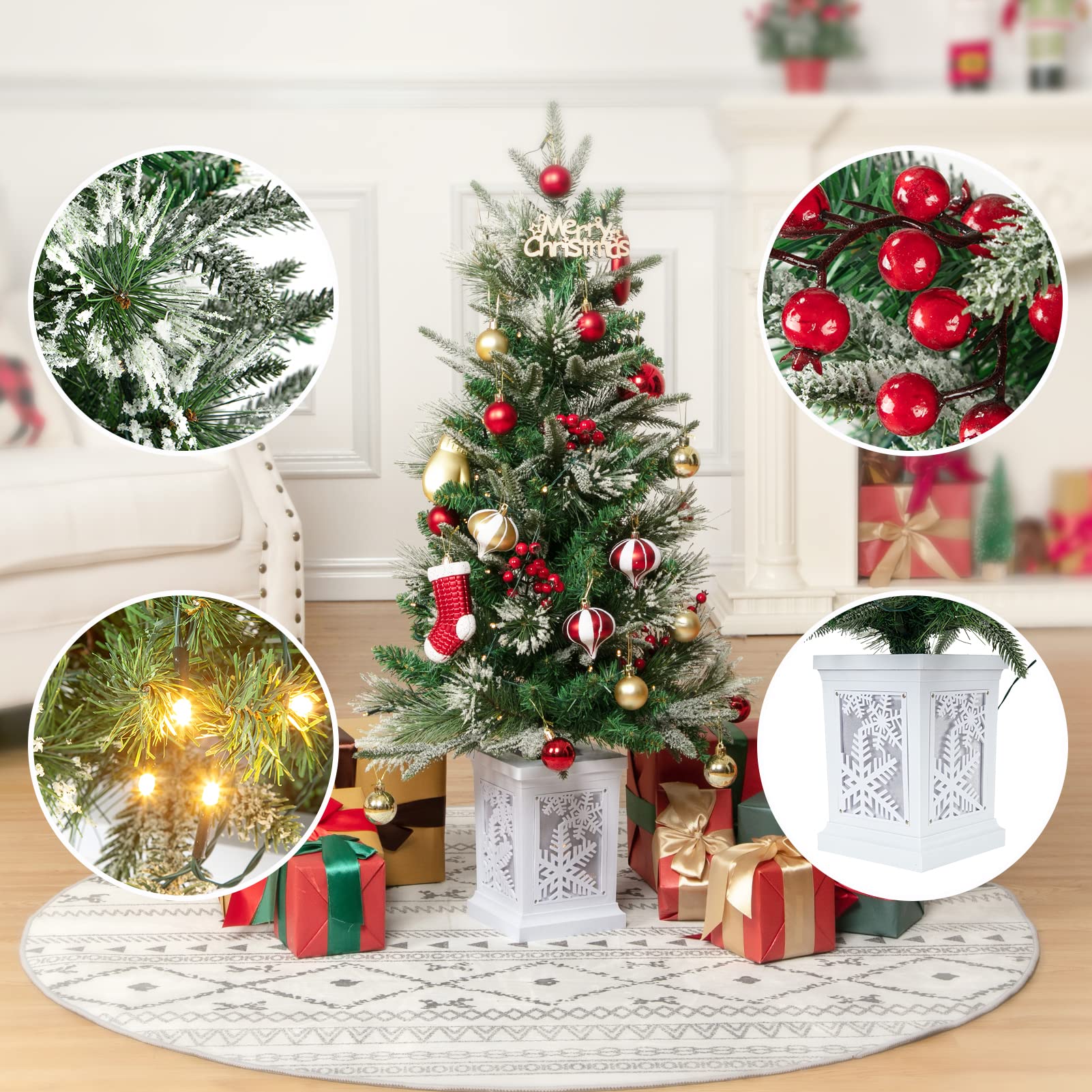GAOMON 3ft Mini Prelit Premium Snow Flocked Artificial Christmas Tree, Pre-lit Xmas Pine Tree for Christmas Decoration, Party Decoration, Home, Office, White Base