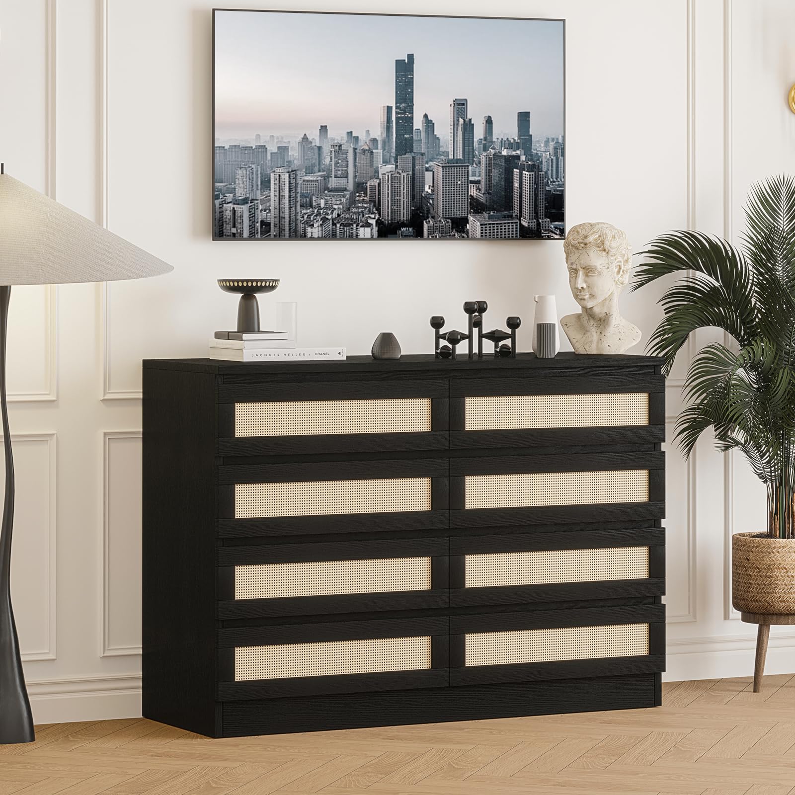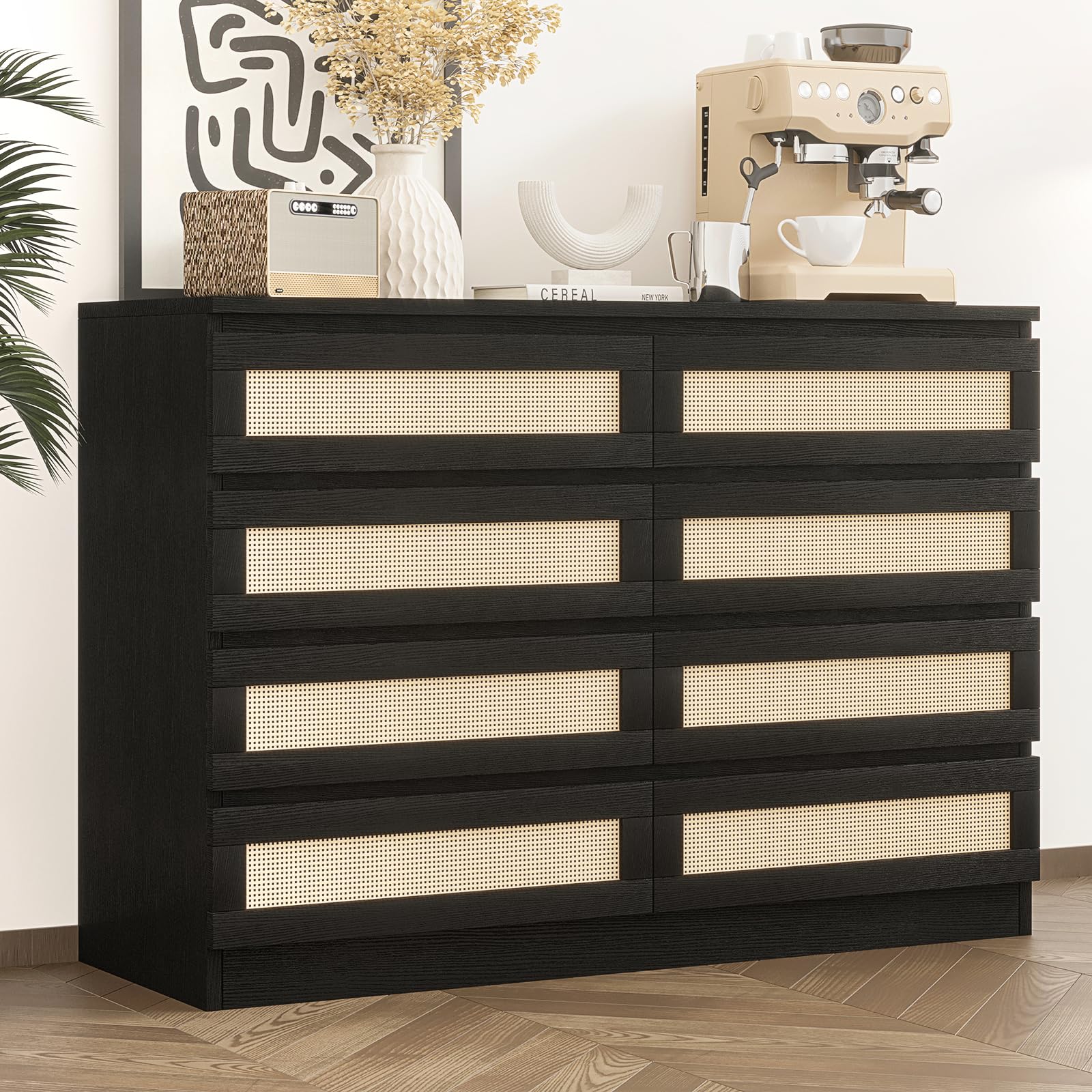 GAOMON 8 Drawer Double Dresser for Bedroom, Rattan Chest of Dressers, Modern Wooden Dresser Chest, Beside Table for Closet, Nursery, Living Room and Entryway, Black