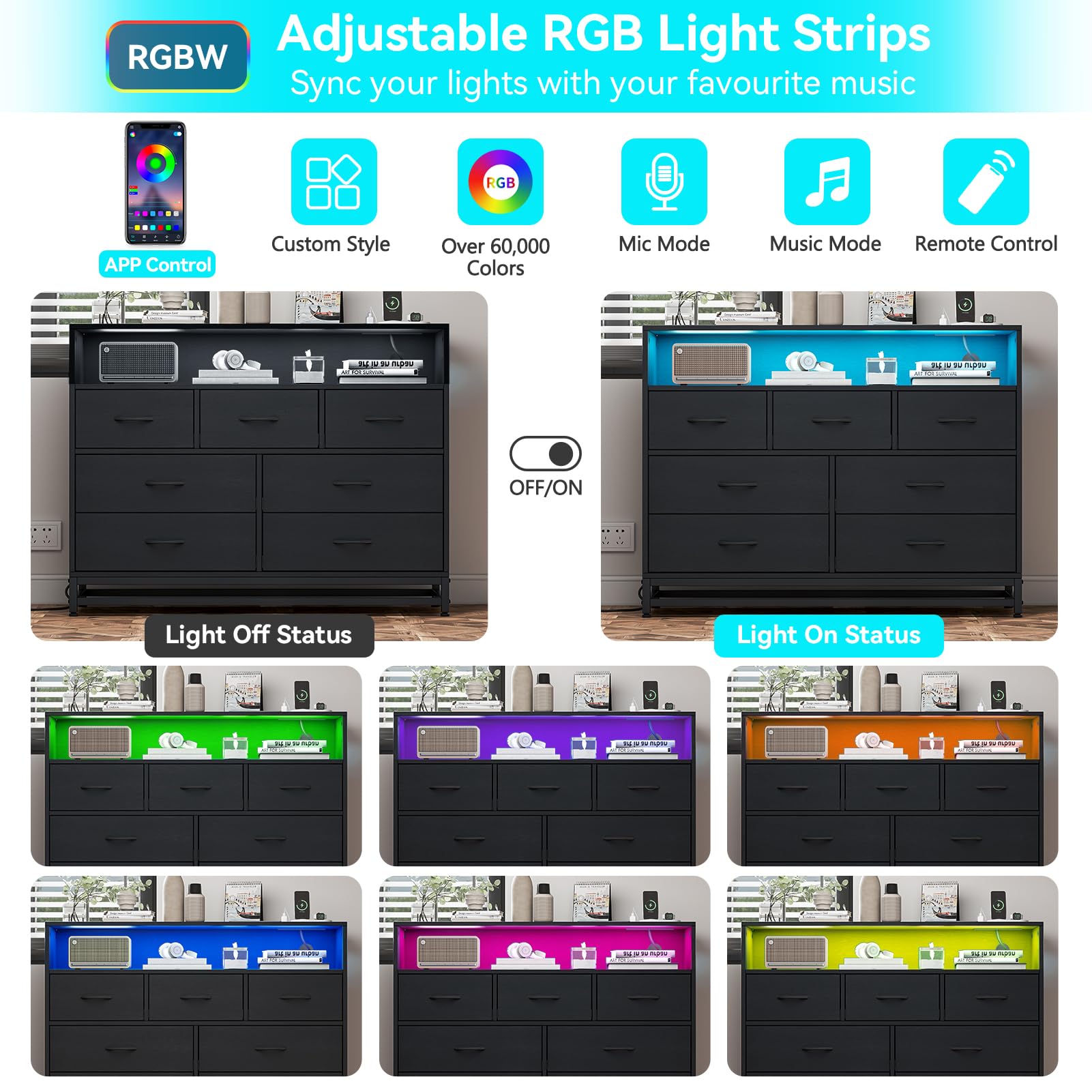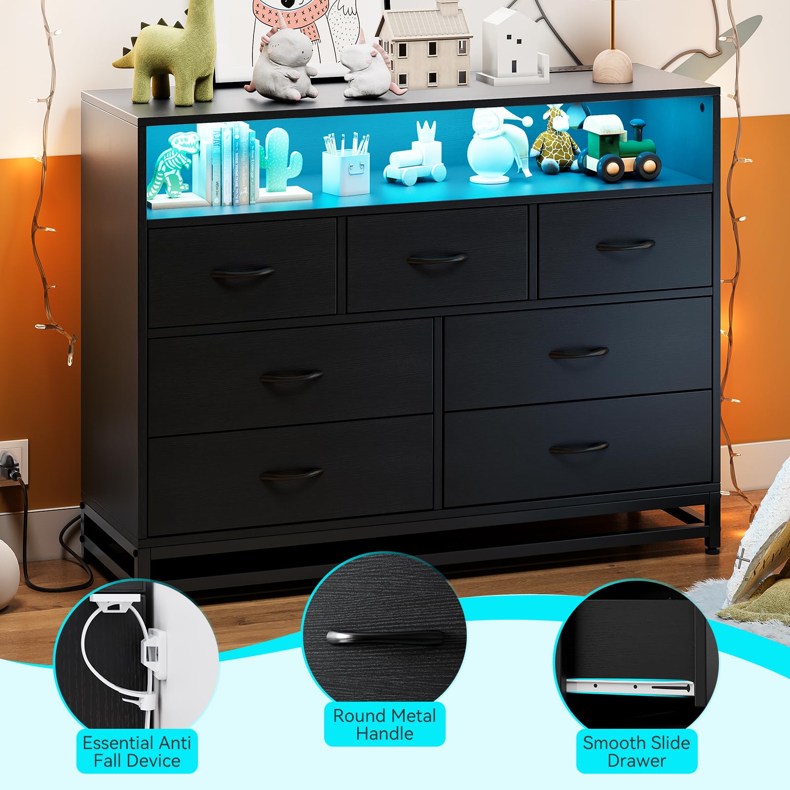 GAOMON Black Dresser for Bedroom, Modern 7 Drawers Long Dresser with Charging Station and LED Lights Design, Wooden Large Capacity Storage Chest of Drawers, Wide Dresser for Living Room, Hallway