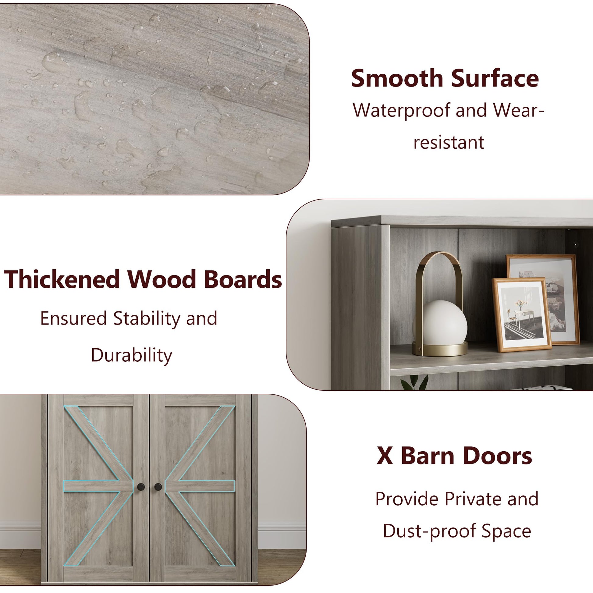 Farmhouse Style: Features wood grain surfaces with X barn doors to add a touch of rustic charm for a farmhouse look and feel.