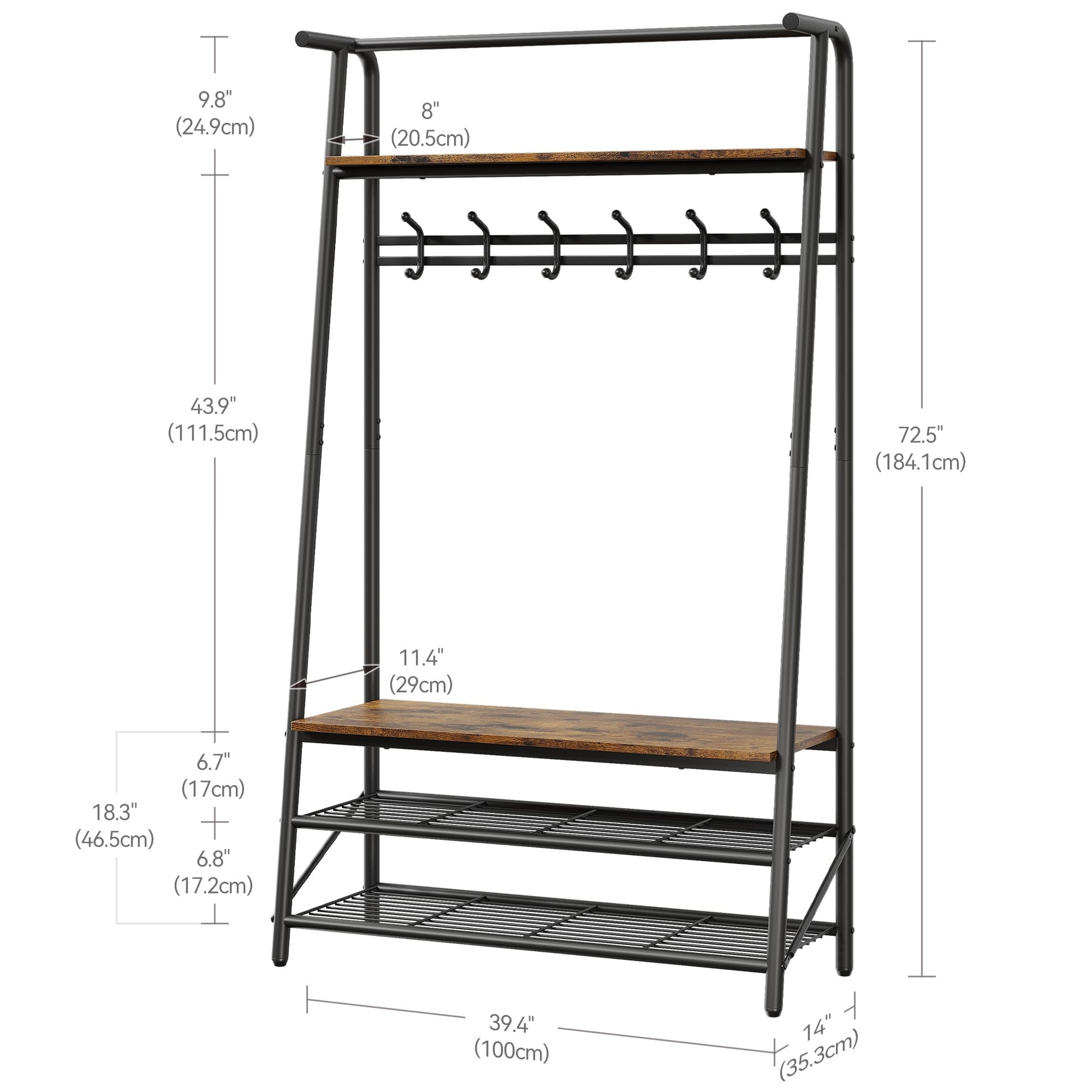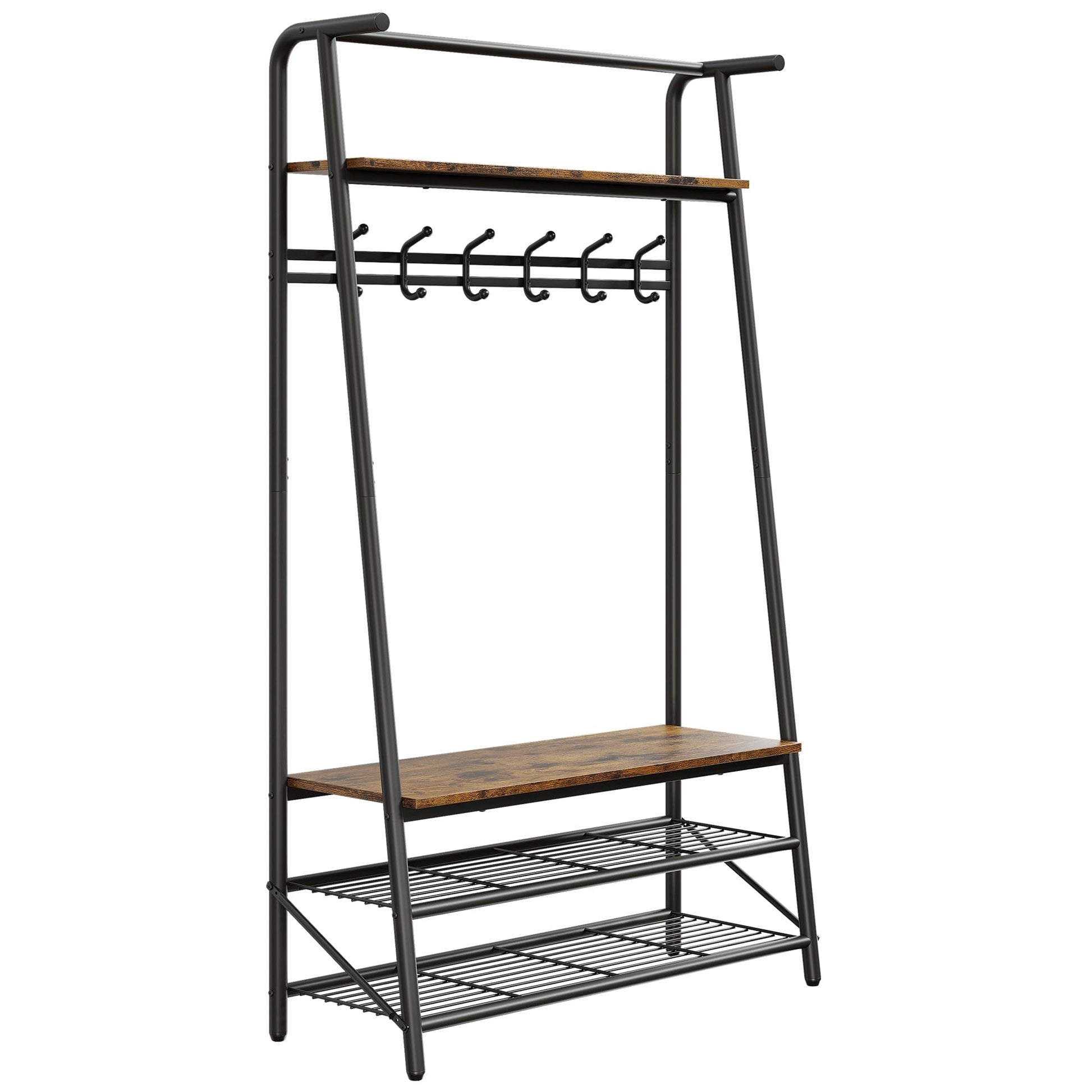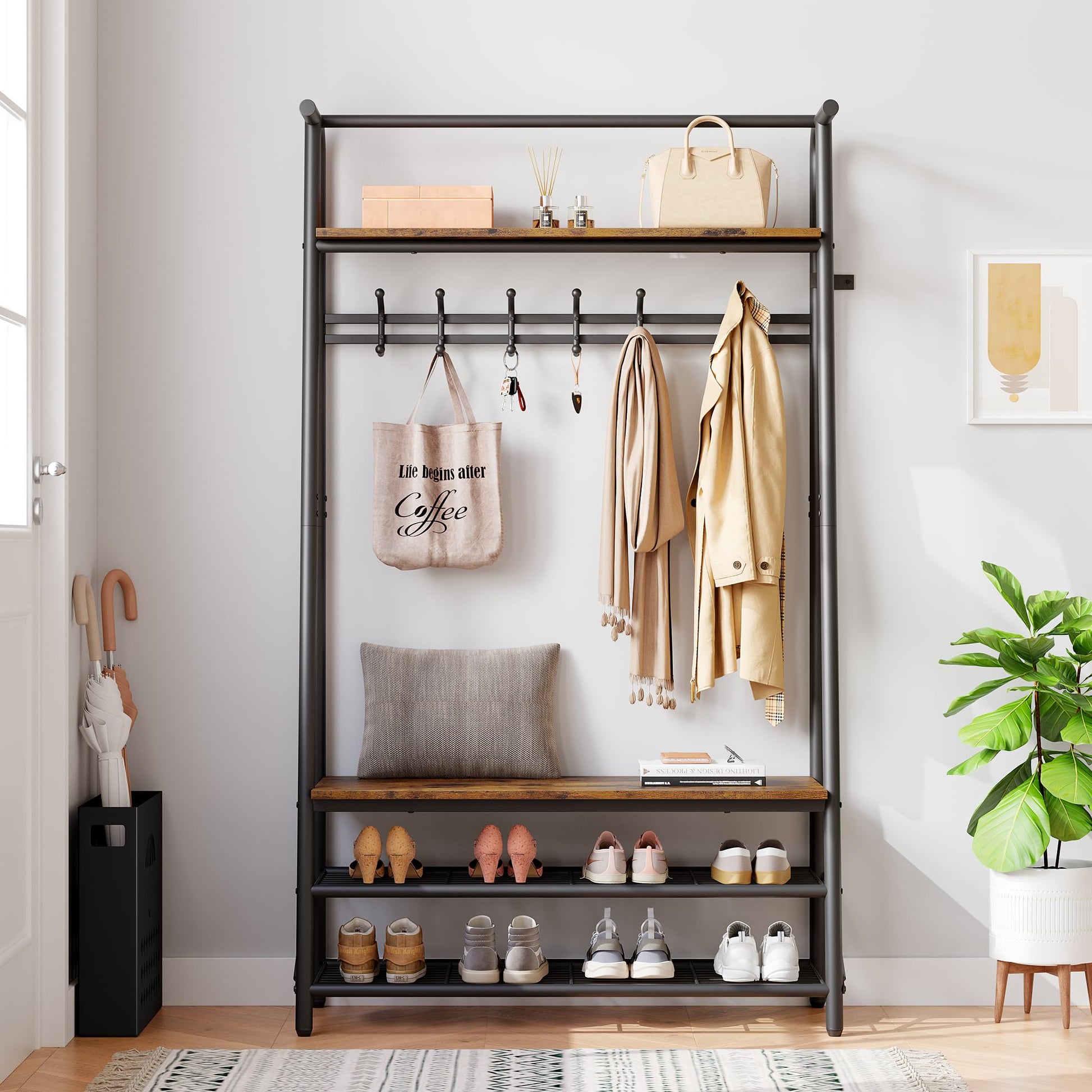 GAOMON Coat Rack Shoe Bench, 4-in-1 Hall Trees Entryway Bench with Coat Rack and Shoe Rack, Wood Look Accent Furniture with Steel Frame Storage Shelf and Hanging Bar, Industrial, Rustic Brown & Black