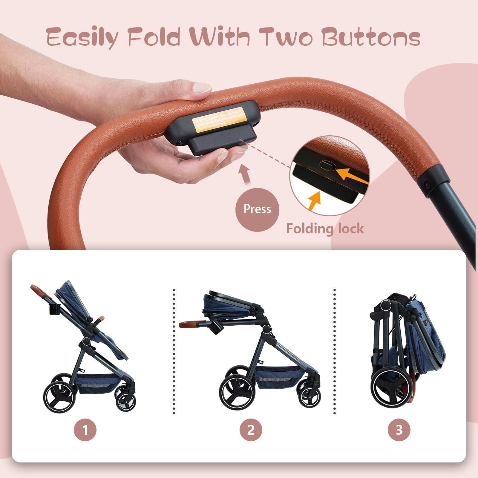 GAOMON Convertible Baby Stroller, 3 in 1 Reversible Bassinet Stroller for Newborn, Toddler, High Landscape Foldable Pram with Adjustable Backrest and Canopy, Windproof Foot Cover, 5-Point Harness, Blue