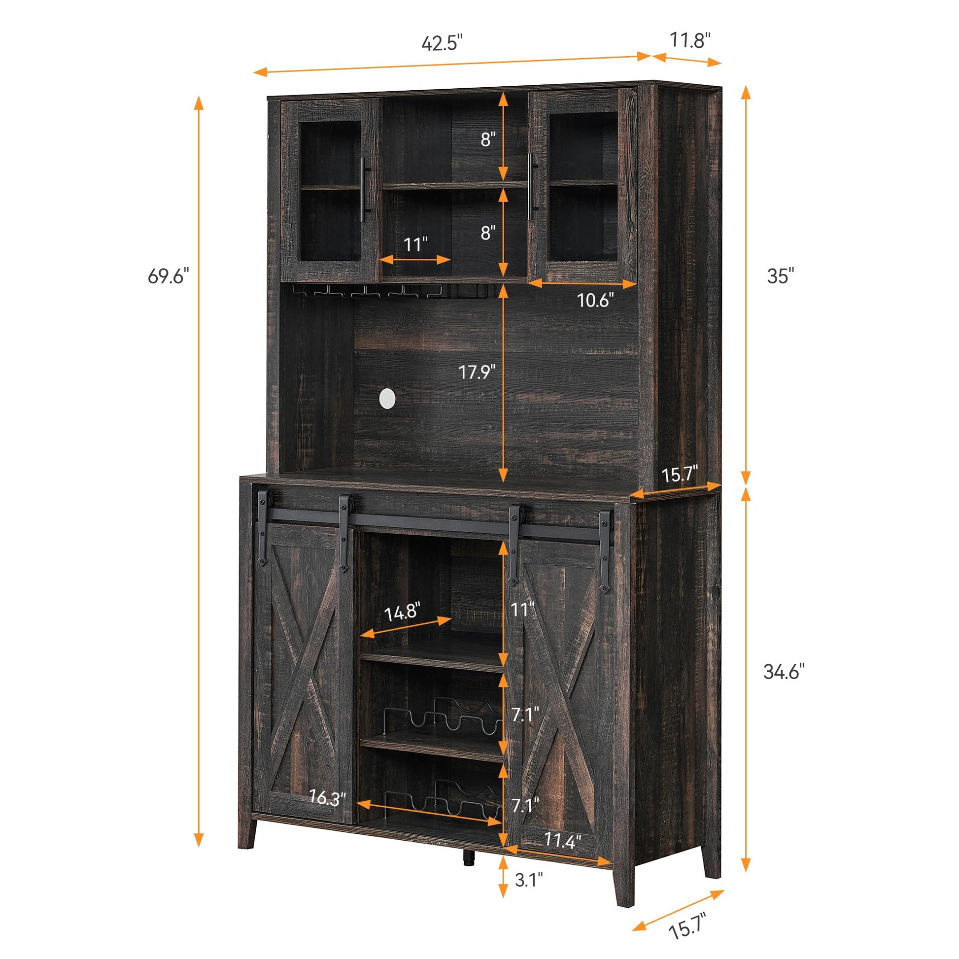 GAOMON Farmhouse Bar Cabinet with Sliding Barn Door, 70 inch Rustic Buffet Cabinet with Storage Shelves, Liquor Cabinet with Wine and Glasses Rack, Sideboard Cupboard for Kitchen, Dining Room,Dark Oak