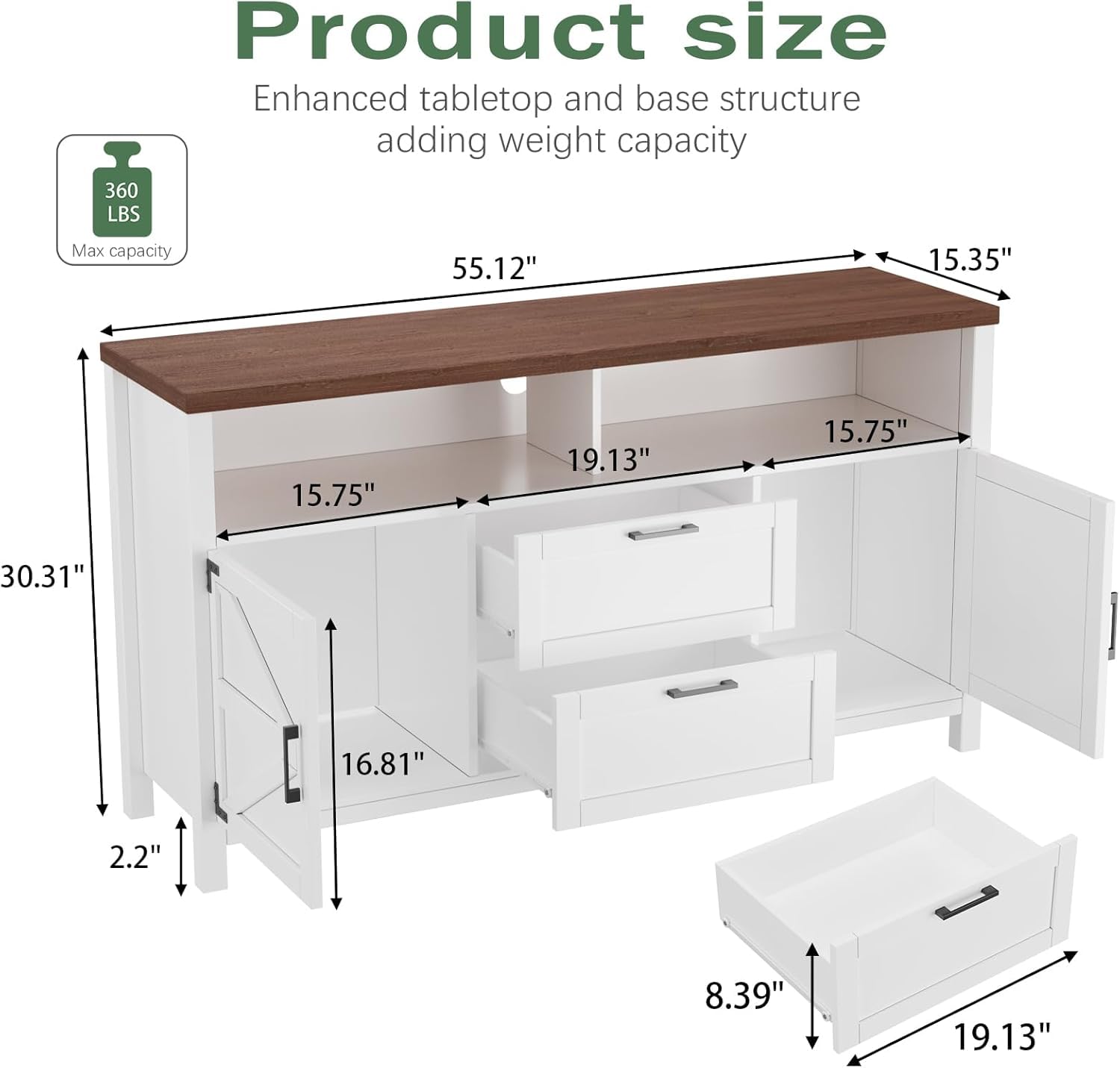 - ?¡¾Elegant Outlook¡¿Experience the perfect blend of rustic charm and modern elegance with our elegant rustic TV Stand. Measuring 15.4"D*"55.12W*30.31"H, it can easy accommodates TVs up to 65inches, becoming the focal point of your living room. Adorned with side cabinets featuring barn doors and drawers, it showcases your farmhouse style. Stay organized and enjoy the timeless of the weathered finish that complements any home d¨¦cor.