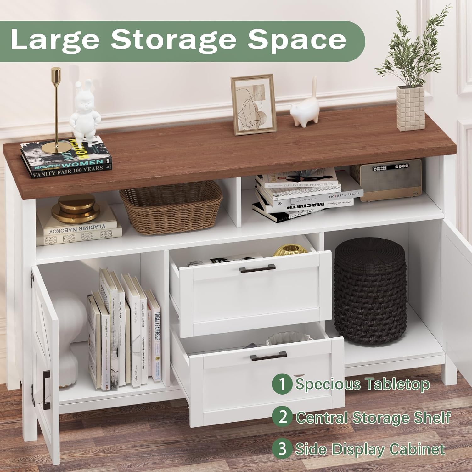 - ?¡¾Classic Farmhouse Style¡¿ With its charming farm door design and vintage hardware accents, this farmhouse television console table exudes a classic farmhouse aesthetic.The classic color and wood grain pattern table top blend seamlessly with modern and industrial design while maintaining a rustic and minimalist aesthetic. it can compatible well with any decor of your room, perfect combination with other furniture accessory.