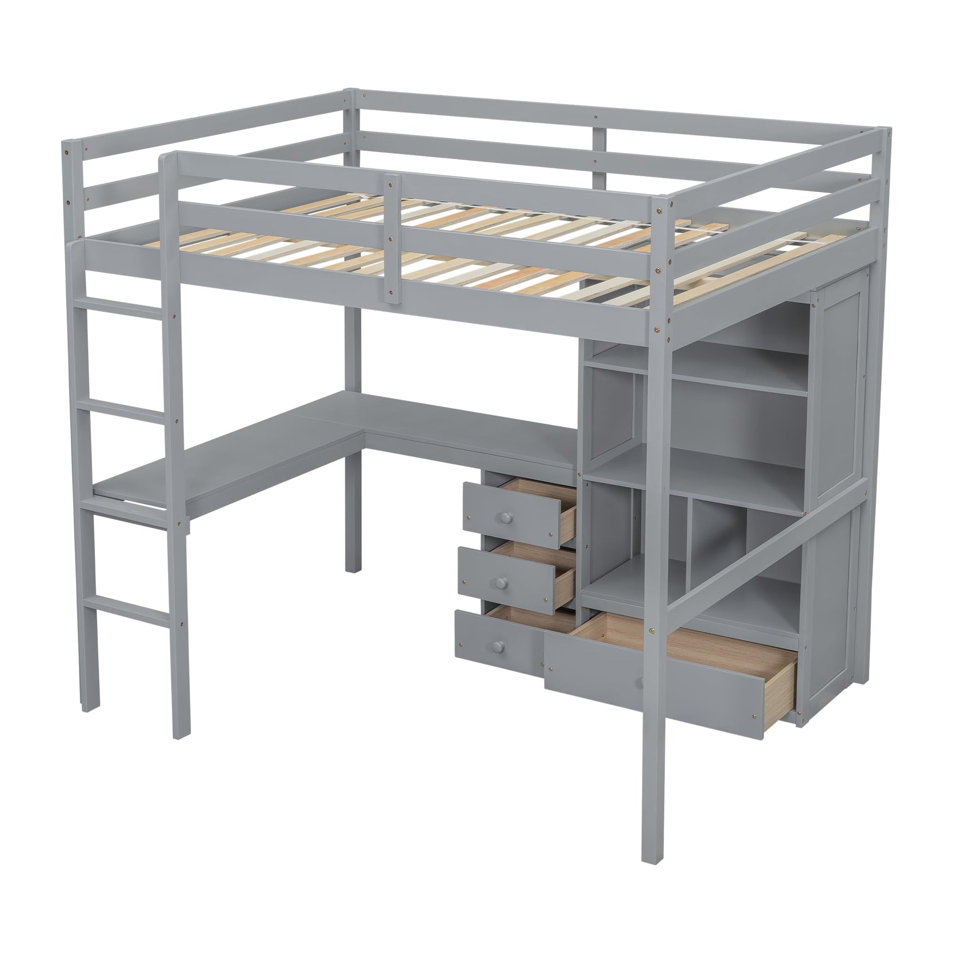 GAOMON Full Size Loft Bed with Desk, Storage Shelves, Drawers, Guardrail and Built-in Ladder, Full Loft Bed Frame, Space Saving, High Loft Bed for Kids Bedroom Apartment, Grey