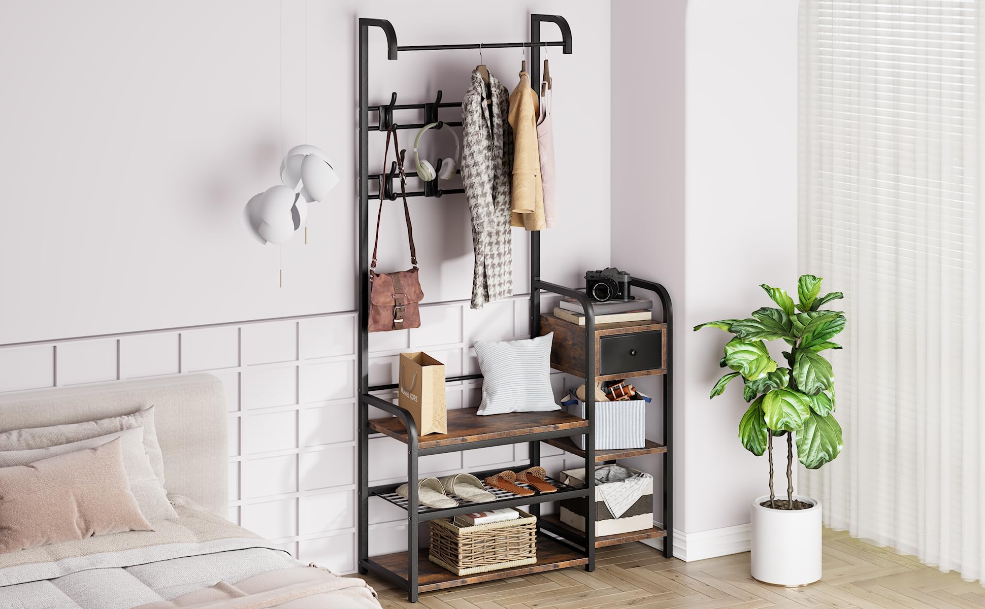 GAOMON Hall Tree for Entryway, 5-in-1 Hall Tree Storage Bench with Drawer, 8 Hooks Coat Rack Cloth and Shoe Bench Shelf for Small Spaces, Bedroom, Apartment, Retro Brown