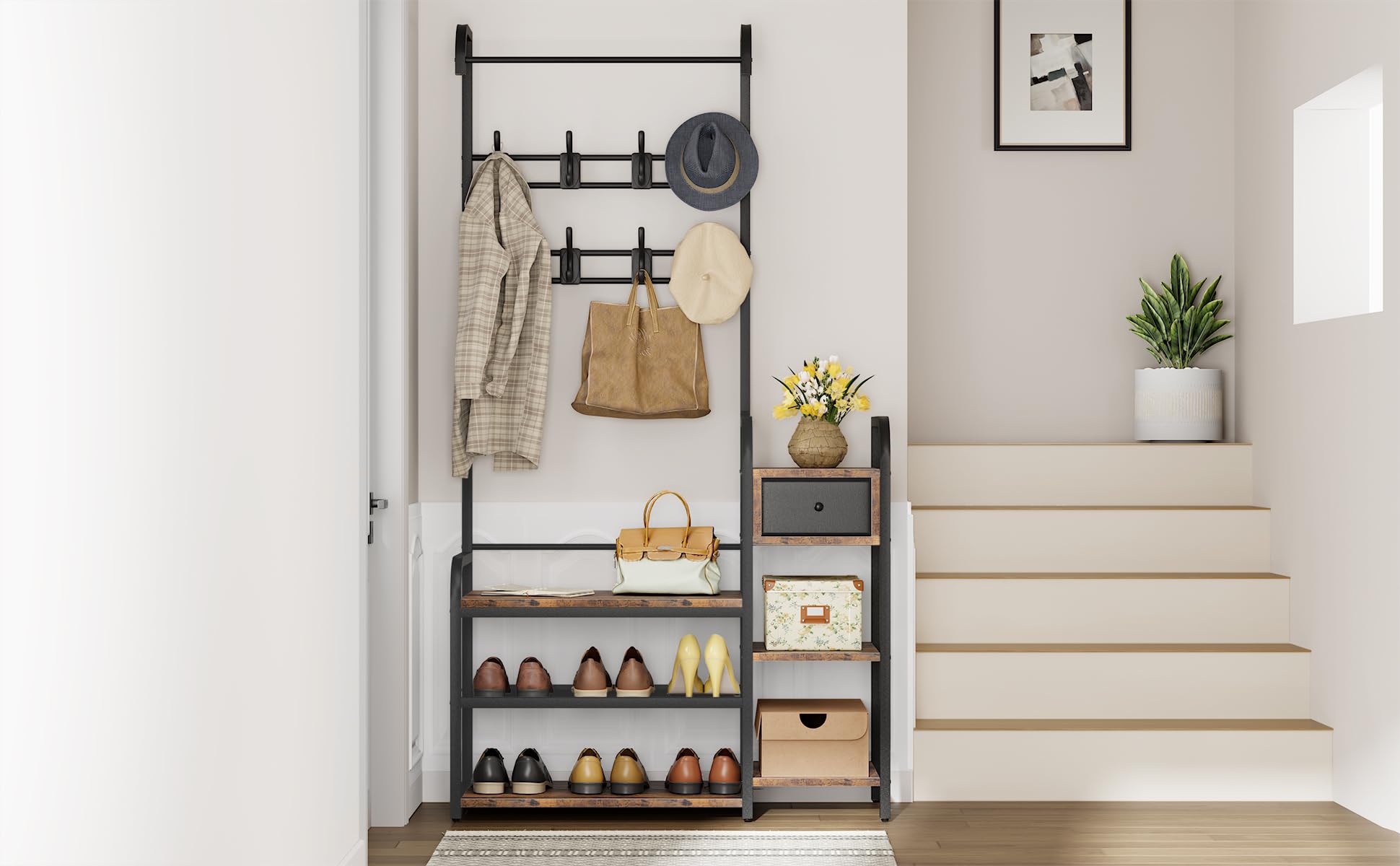 Multifunctional shelves can help you organize your items. The Hall tree can store hats, clothes, bags, shoes, and small items to make the space tidier.