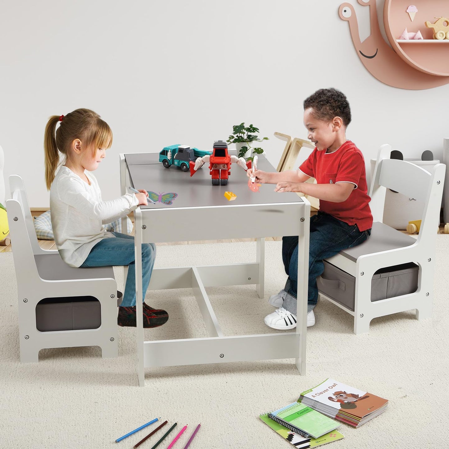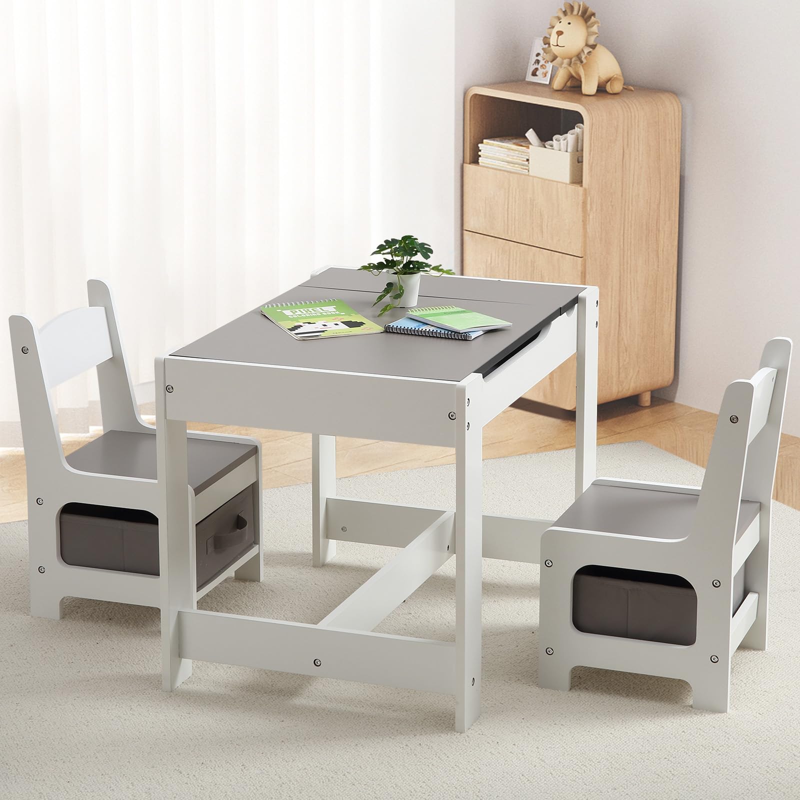 GAOMON Kids Table and Chair Set, 3 in 1 Wooden Activity Table with Storage Drawer for Toddlers Arts, Crafts, Drawing, Reading, Playroom, Toddler w/ 2 in 1 Tabletop, Storage Space, Gift for Boy Girl (Grey)