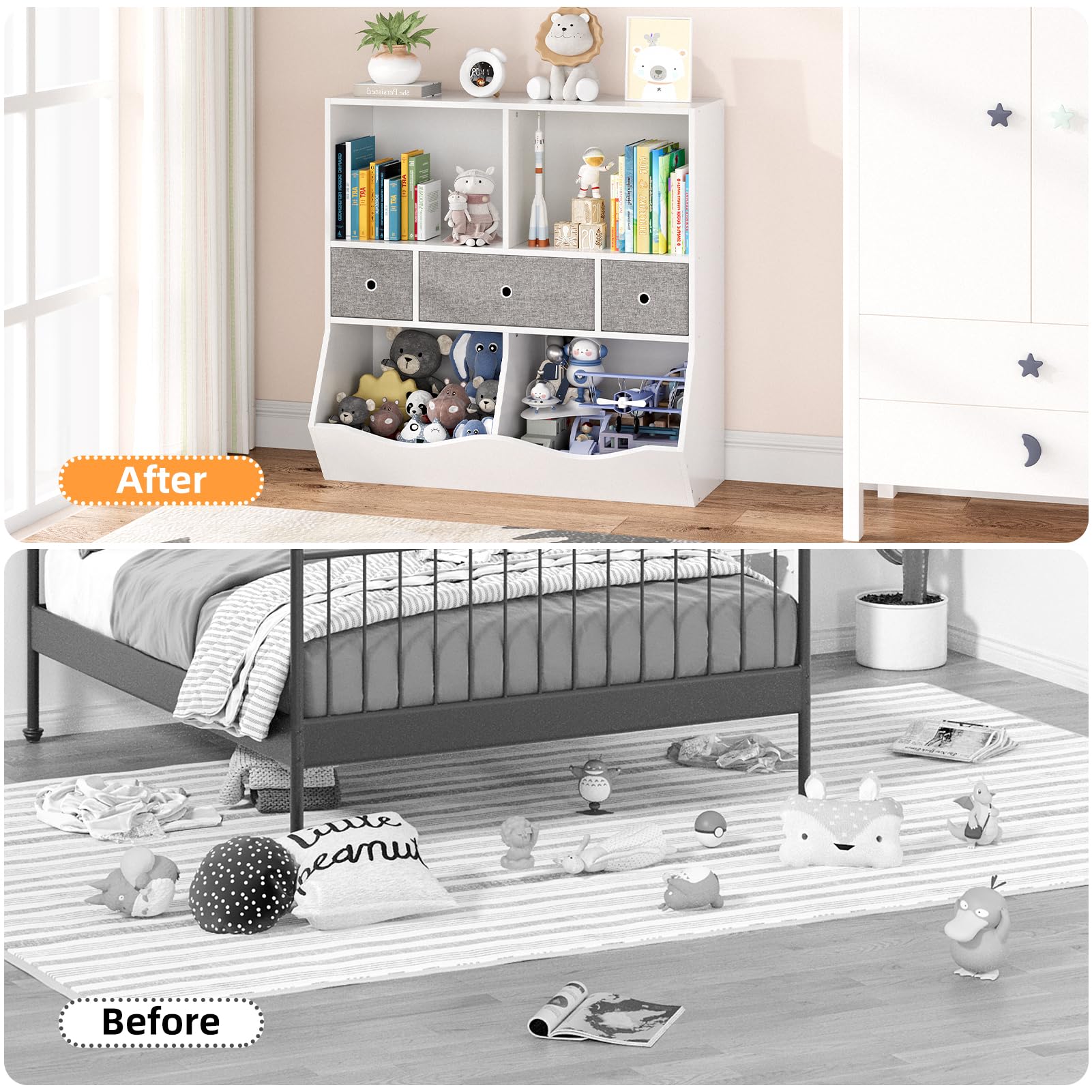 - ¡¾??????????-???????????????????? ??????????????¡¿With 2 open compartments for storing children's favorite books and notebooks, 2 tilted storage bins for blocks, toy cars, dolls, and 3 removable drawers of different sizes for storing art supplies, Rubik's cubes, small toys, etc., this kids toy storage organizer keeps children's rooms tidy and organized, avoiding scattered toy boxes everywhere.