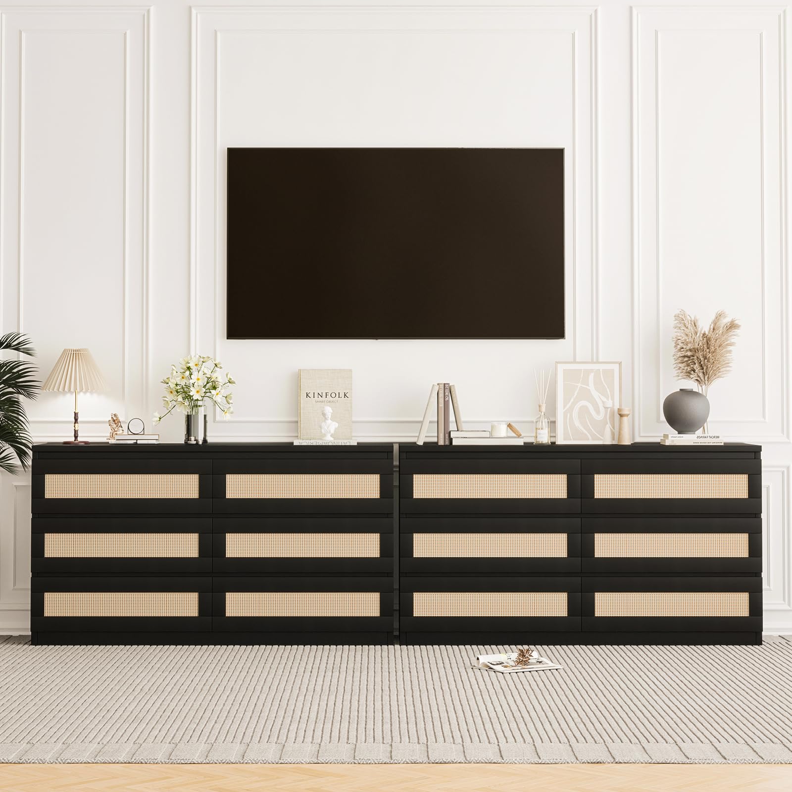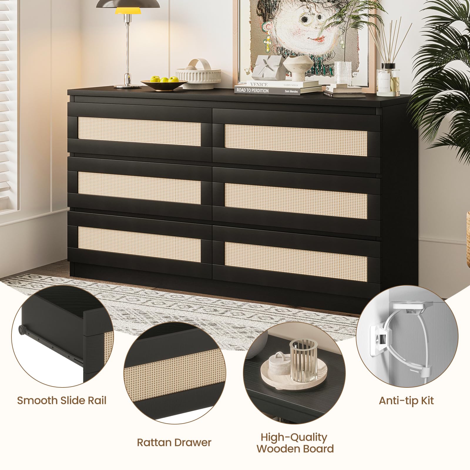 GAOMON Rattan Dresser for Bedroom, Modern 6 Drawer Double Dresser with Anti-Tip Kit, Wood Storage Wide Chest of Drawers for Bedroom, Living Room, Hallway, Black