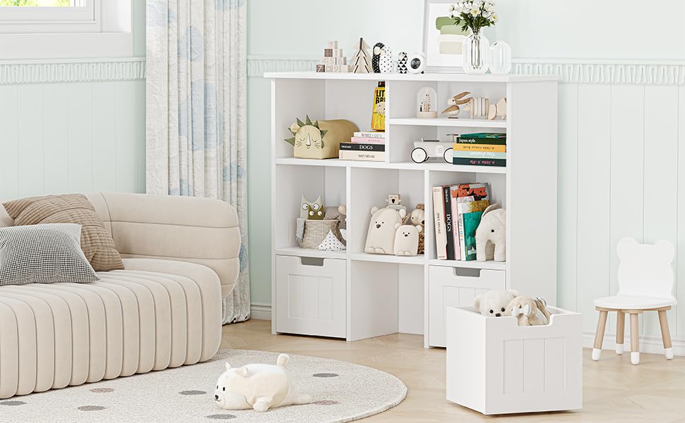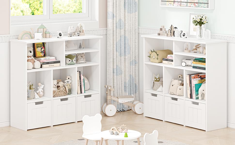 GAOMON Toy Storage Cabinet with 3 Movable Drawers & 6 Cubes, Children's Toy Shelf Kids Bookshelf with Hidden Wheels, Kids Bookcase Toy Storage Organizer for Bedroom & Playroom & Nursery (White)