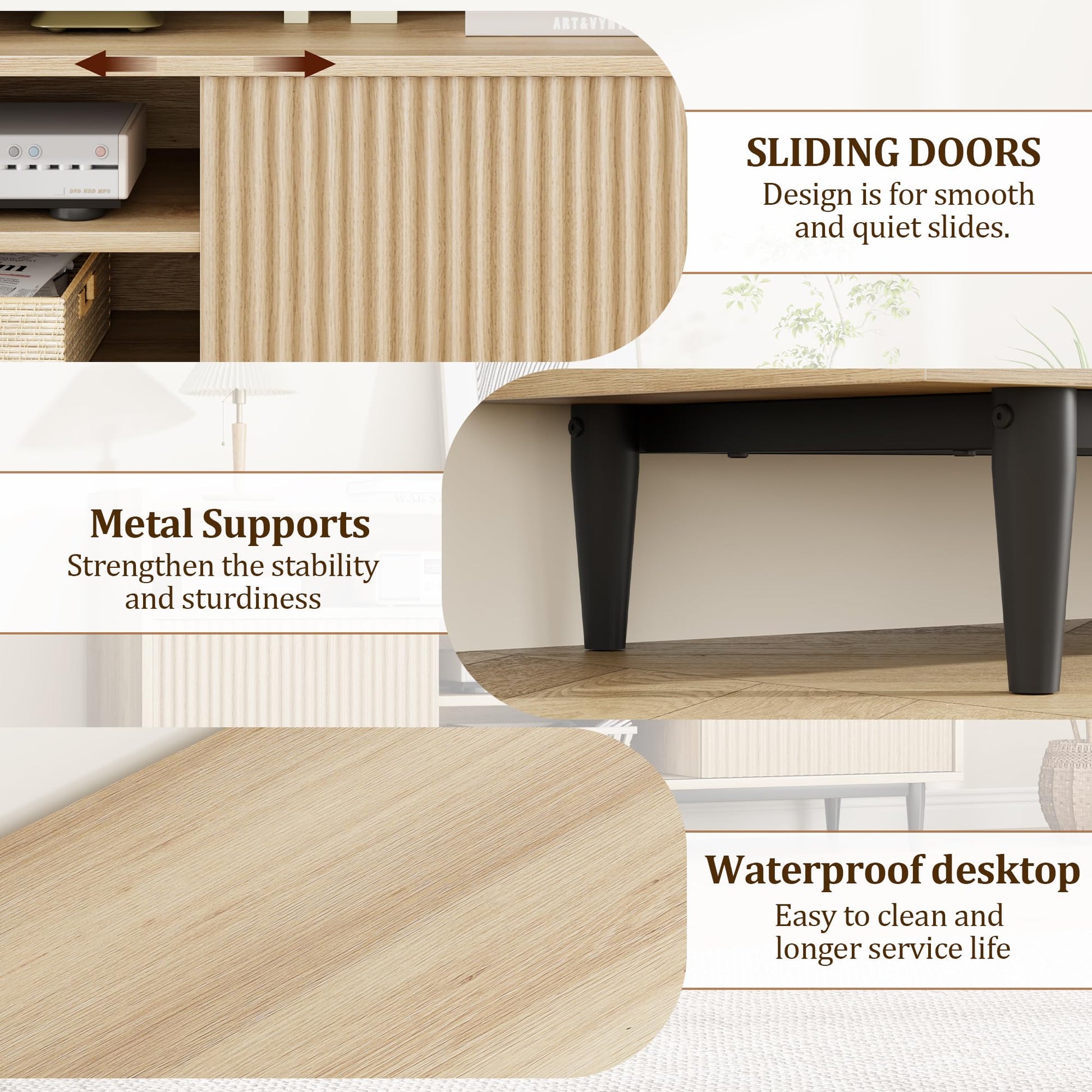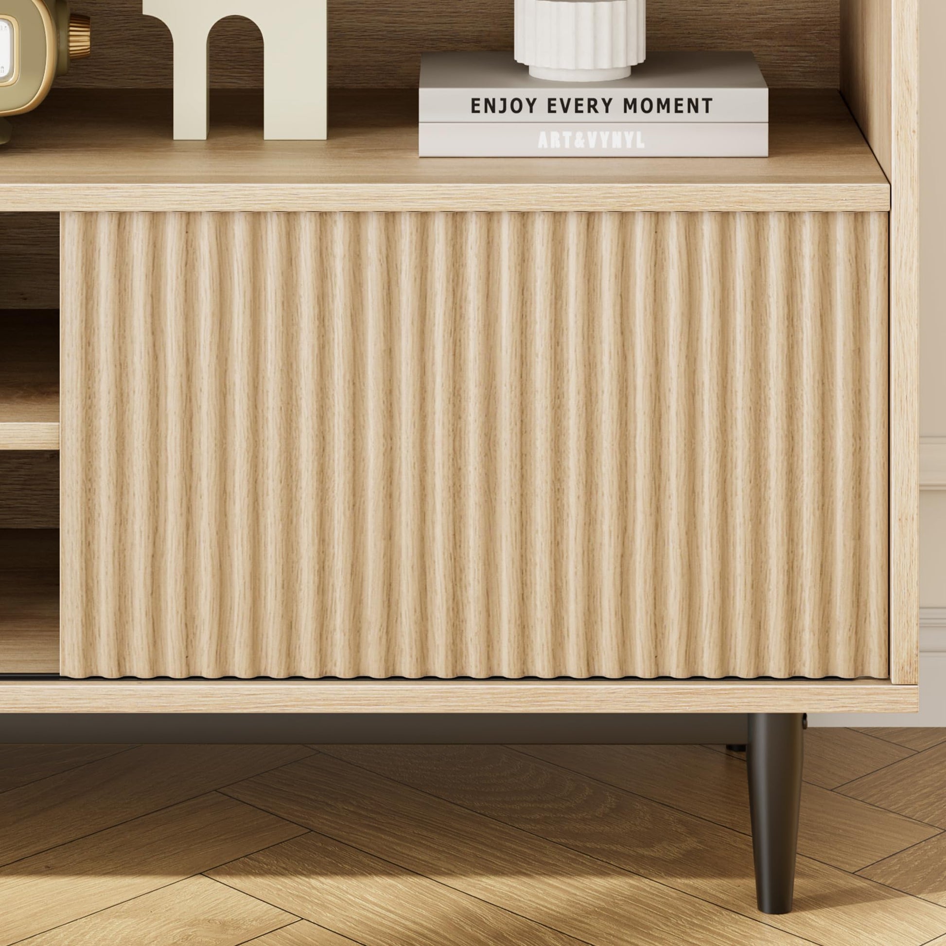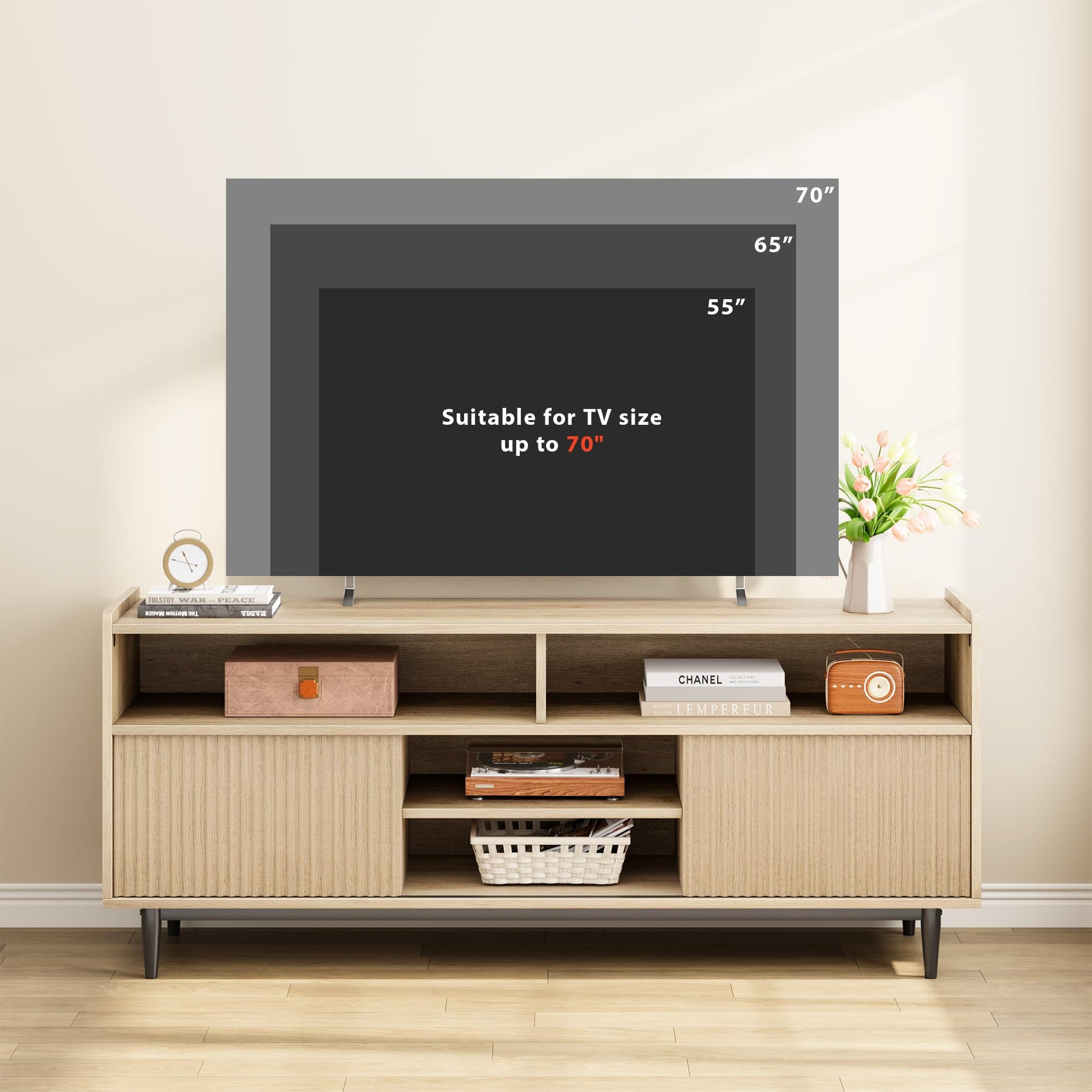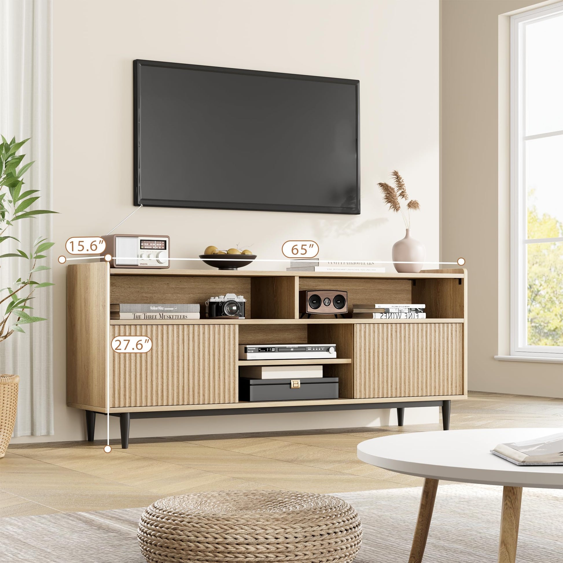 - CHIC DESIGN: This TV stand seamlessly combines a wooden entertainment center with fluted doors, integrating boho style more harmoniously into this TV cabinet. Black legs enhance the overall rustic appearance, adding a fashionable style and creating a perfect visual experience. Also its versatile style can easily integrate into your house and suit most decor styles.