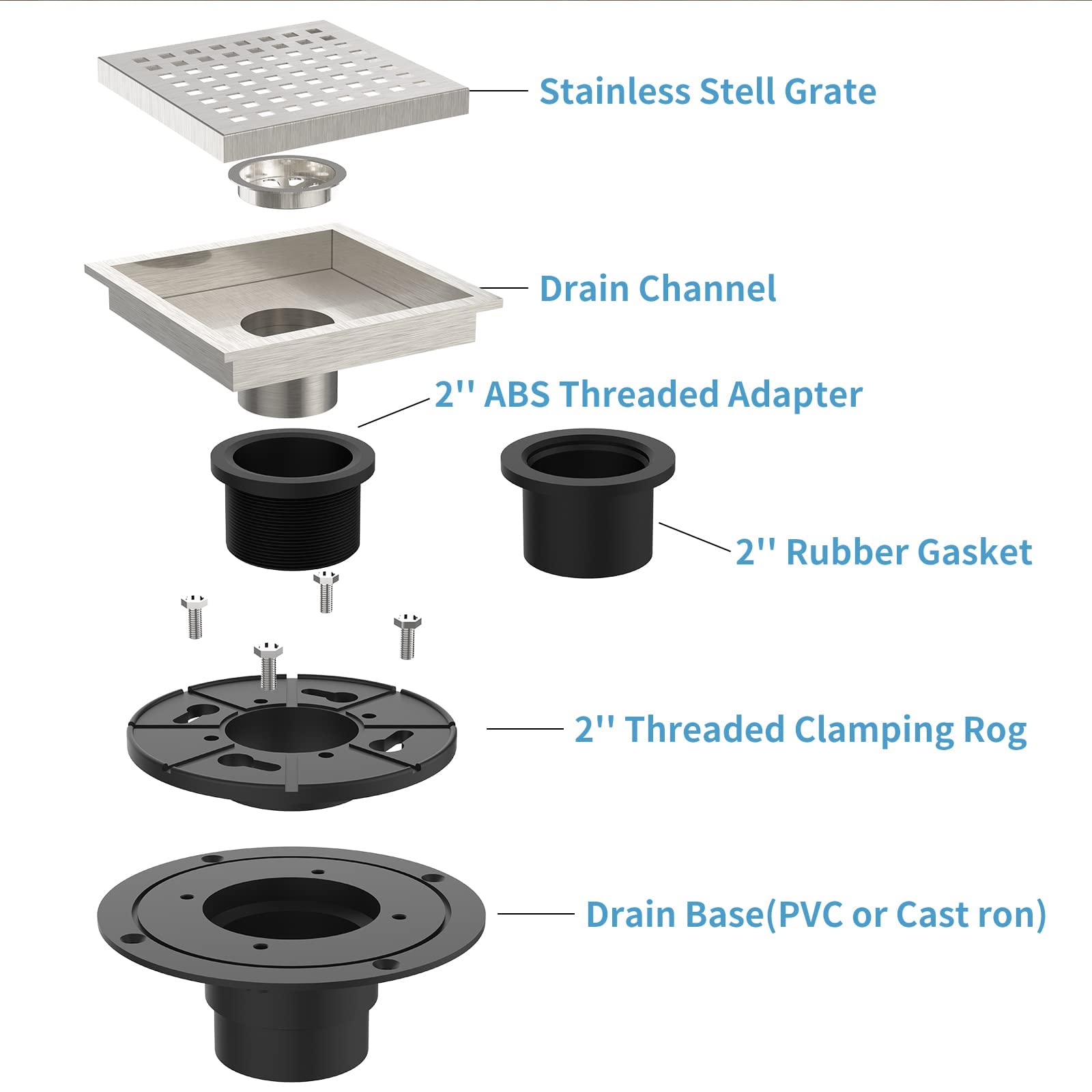 This 6 inch shower drain easy to install, fits US NO HUB Drain Base System, all parts needed for installation are included in the package; Applicable to a wide range of scenarios, can be used in bathroom, kitchen, pool, balconies, garage, basement and toilet etc.