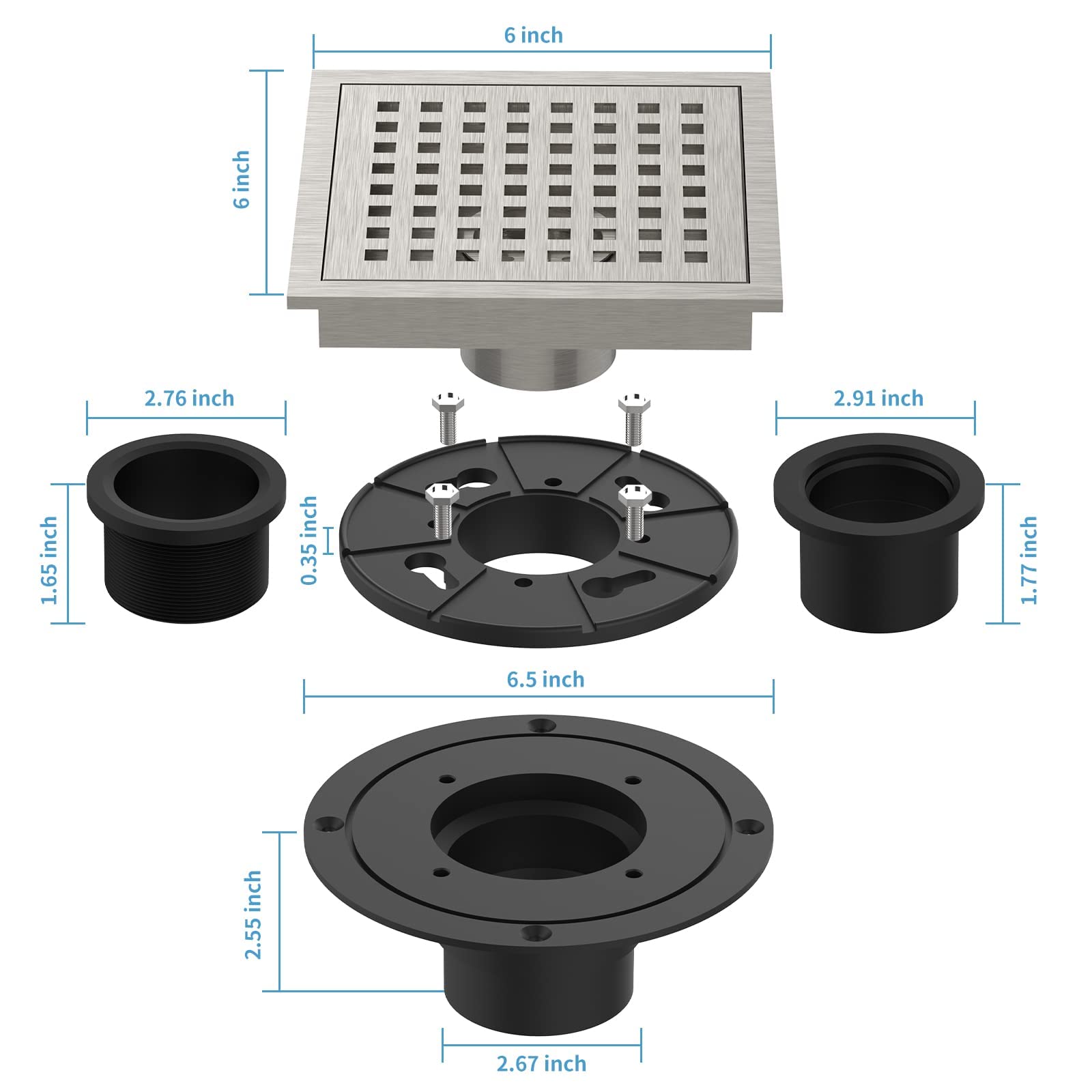 6" length, 6" width, The diameter of outlet is 2 inches. 48 L/min high flow capability, solving ponding problem for bathroom, pool effectively. Heavy duty steel cover offer a good sealing ability. Base flange connects to drain pipe, fit standard U.S. plumbing connection.