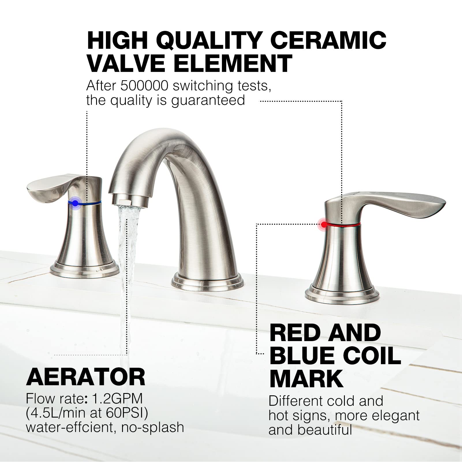 This bathroom faucets has a double-handle design, one cold and one hot, you can easily adjust the hot and cold water of the faucet through the double handles, and you can also adjust the water pressure; Max flow rate: 1.2 GPM.