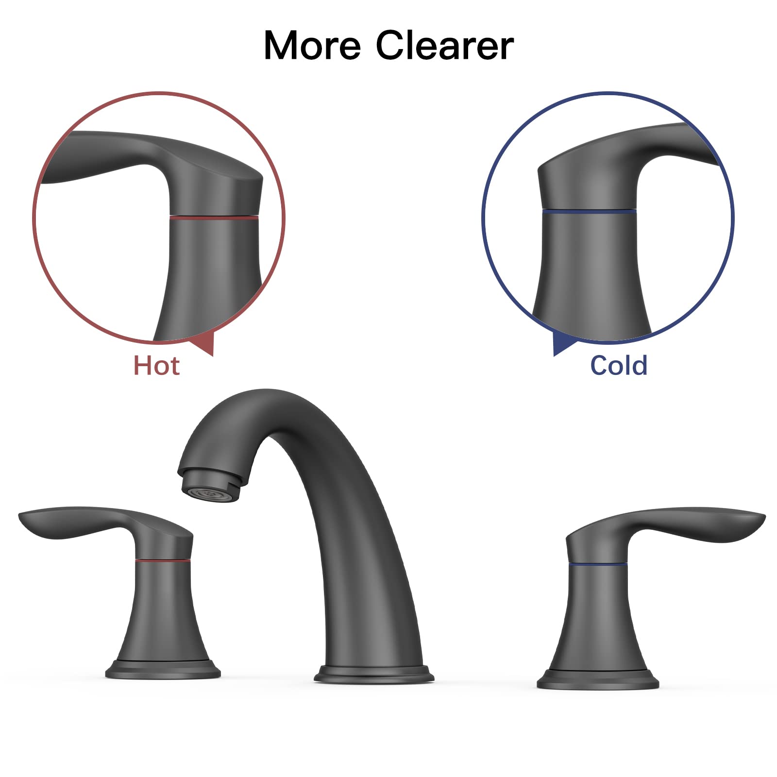 Two handle bathroom sink faucet, double handle for effortless flow and water temperature control; The design of the red and blue rubber ring makes it easier to distinguish between cold and hot water; Gorgeous brushed nickel finish/brushed gold finish will instantly enhance the appearance of any bathroom sink faucet and complements most decorating styles.