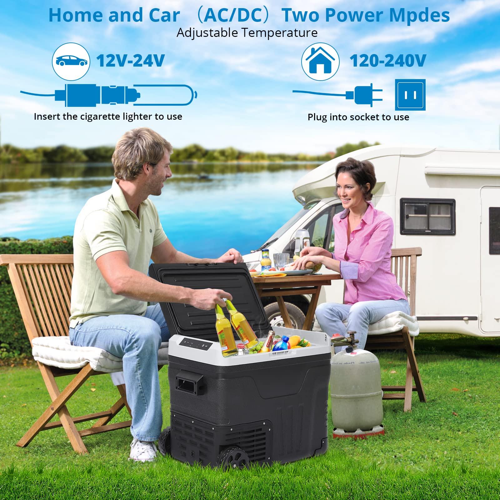 Using ECO energy-saving mode, the operating power of this 53 Qt portable refrigerator is less than 45W. Even when running in MAX mode, its intelligent cycle work power consumption is far below 1kwh/day. You can use 12/24V DC power to operate this portable freezer refrigerator on various vehicles, such as SUVs, trucks, RVs, campers, trucks, boats, etc.