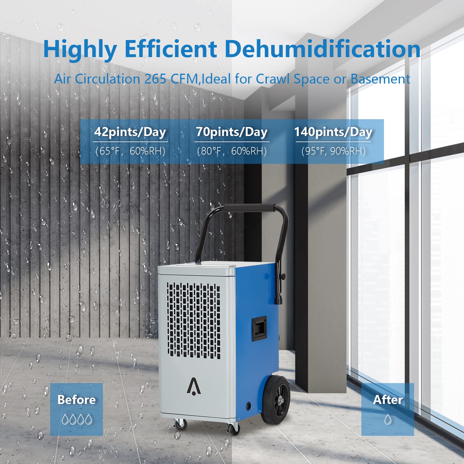 - High performance commercial dehumidifier up to 140 pints of moisture per day