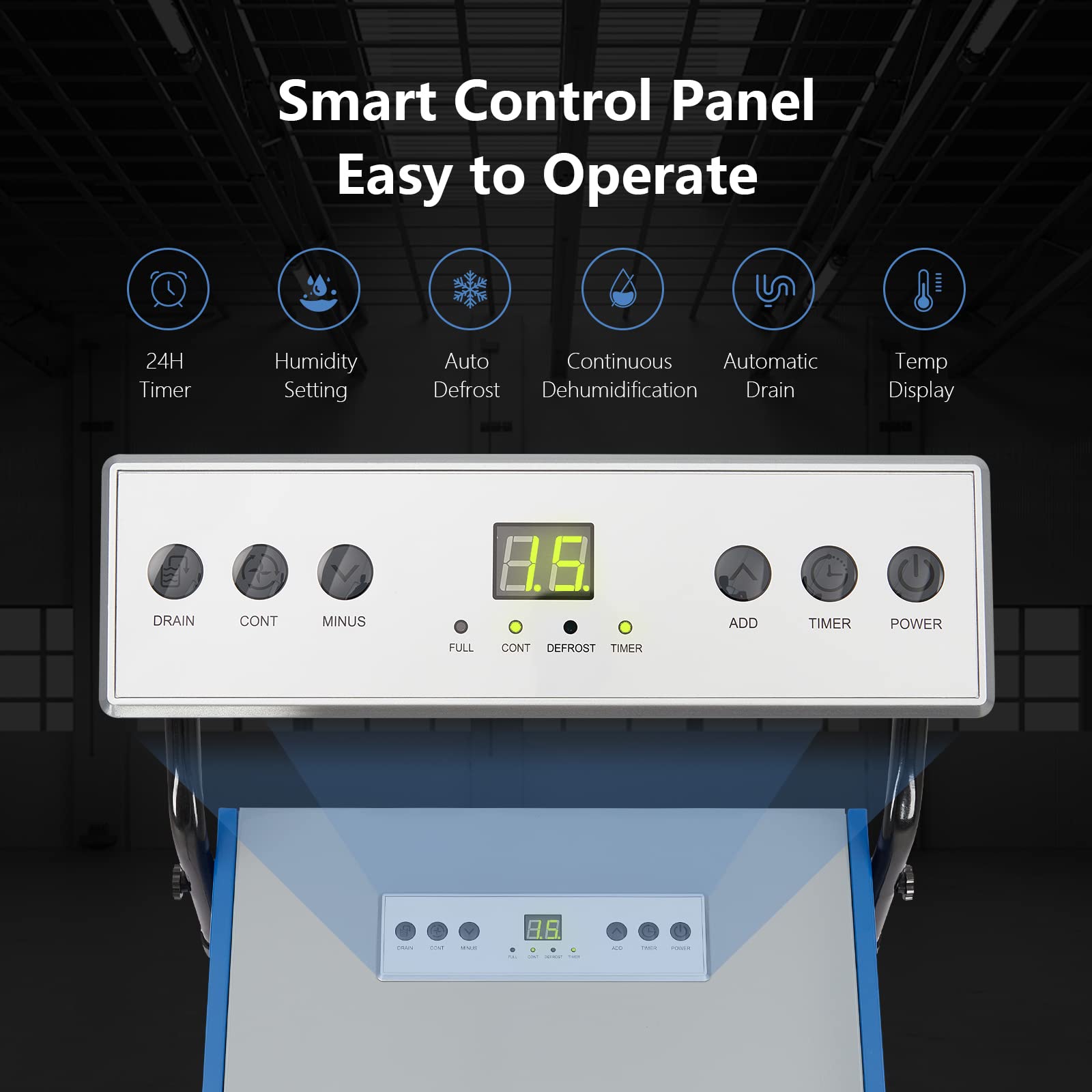 Built-in humidity and temperature sensor to smartly sense room humidity and maintain room humidity in your ideal moisture setting.24H AUTO dehumidifying,the humidity set of the Industrial dehumidifier is adjustable within 20%~90%, meeting the different needs.Auto-restart after power outages, and auto defrost.