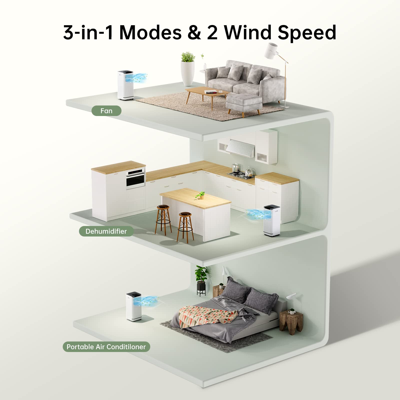 Combining three energy-saving functions with cooling, fan, and dehumidifying modes in one machine, our portable air conditioner meets all your needs. The bucketless and self-evaporative operation ensures your living space stays cool, clean, and dry.