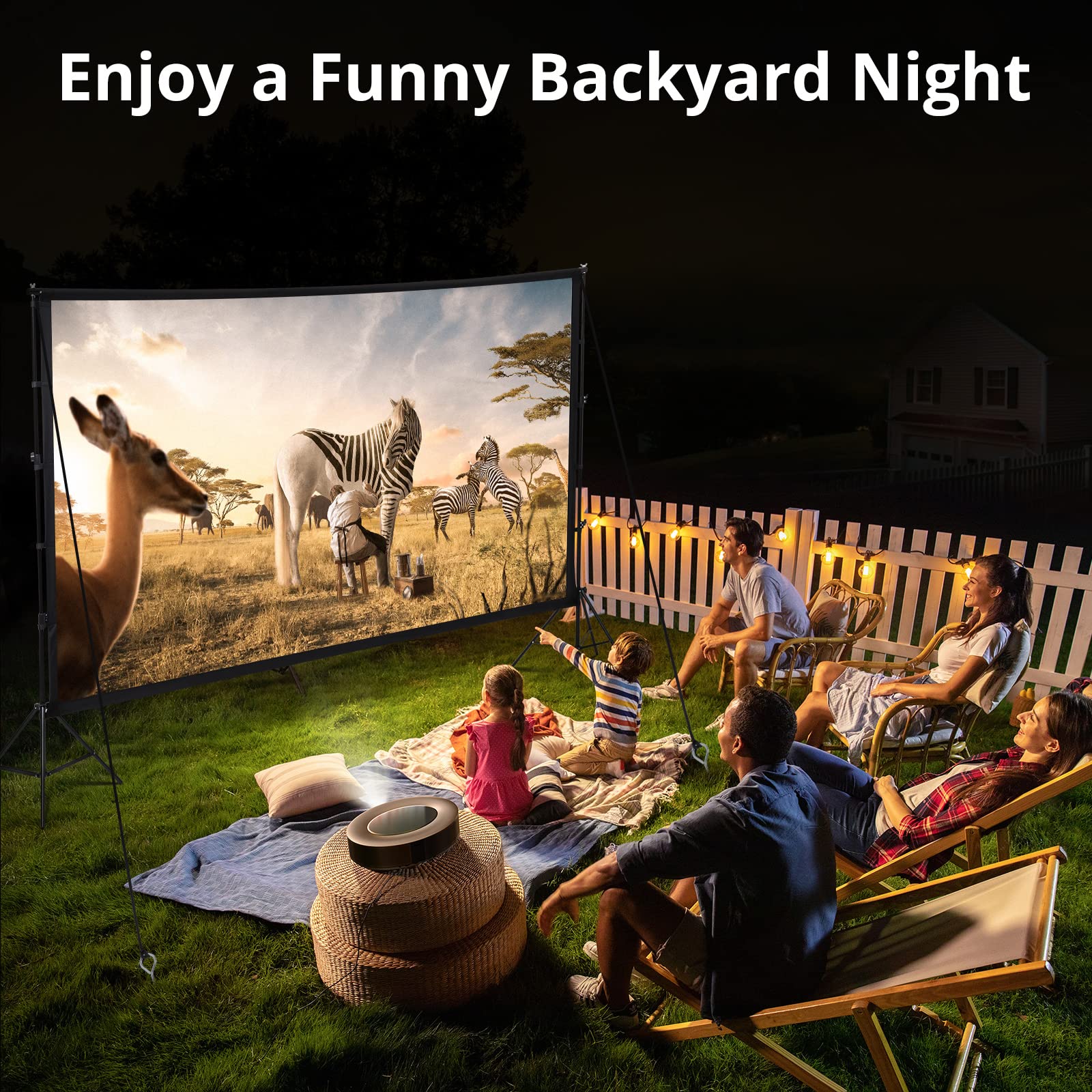 The projection screen can be set up in about 5 minutes without any complicated tools. It comes with a carrying bag, 6 ground nails, 2 windproof ropes, joints and buckles, so you don't need another trip to the store and quickly get fun in watching movies.