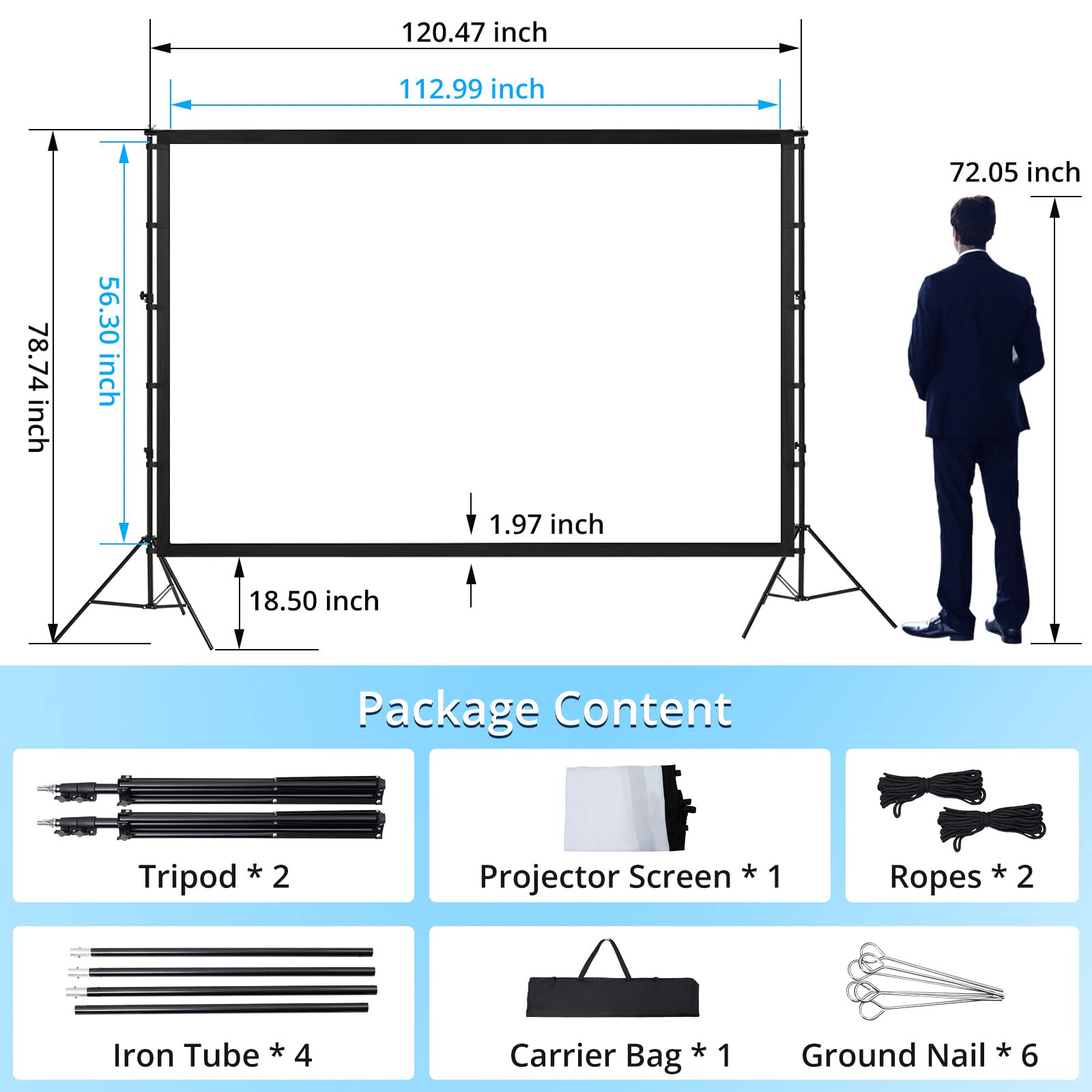 120inch Projector Screen with Stand, 16:9 4K HD Rear & Front Projections Movies Screen, for Indoor Outdoor Home Theater Backyard Camping