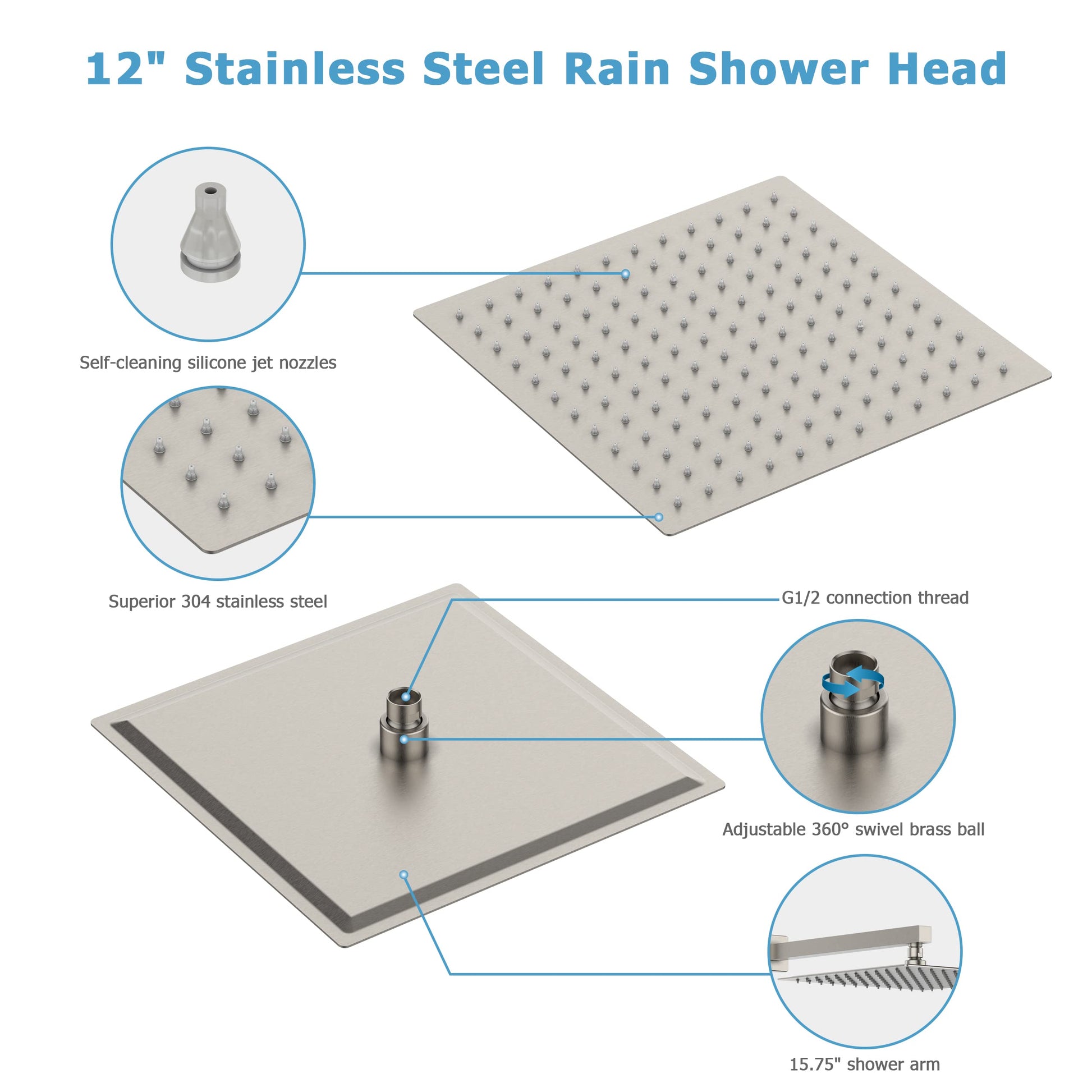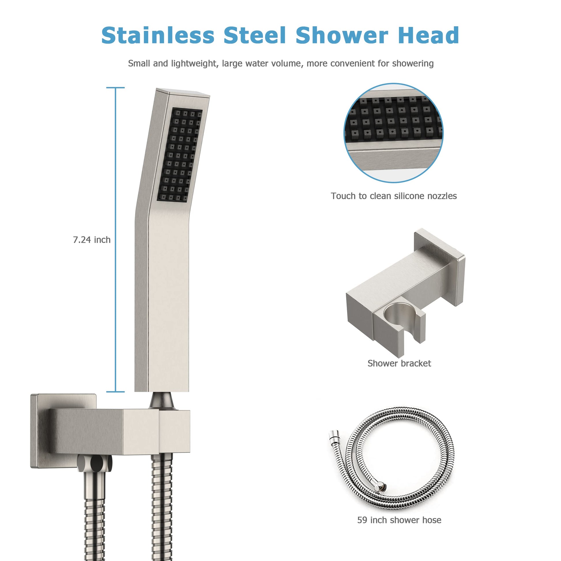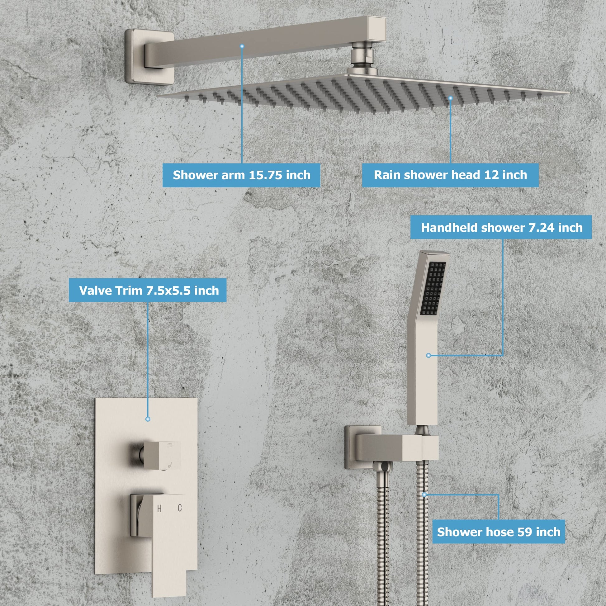 The shower faucet set contain 304 stainless steel 12 inch rain shower head and 304 stainless steel handheld shower, with silicone nozzles allows you to wipe away mineral deposits with the swipe of a finger. With 15.75 inch shower arm and 59 inch stainless steel shower hose, flexible, explosion-proof and anti-kink.