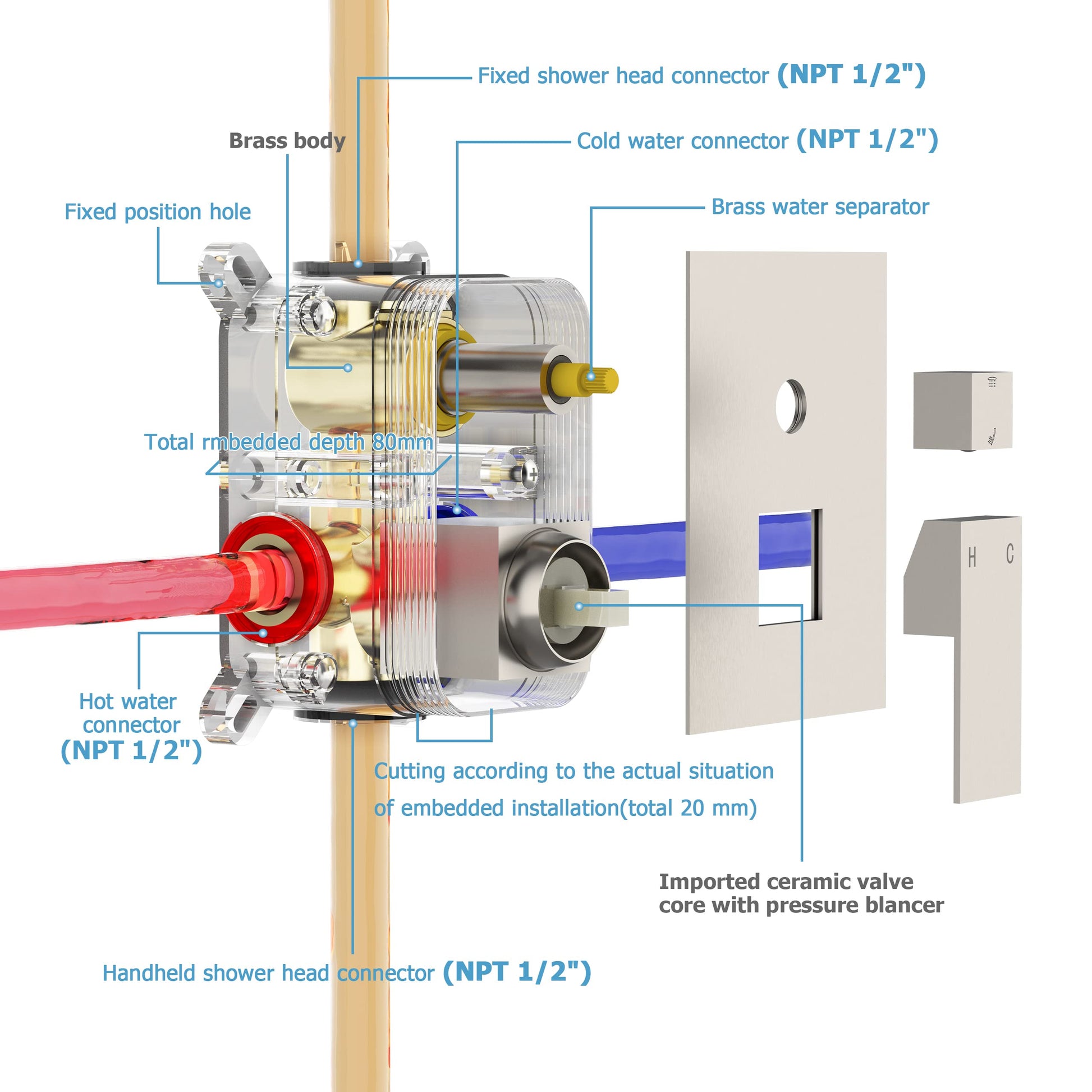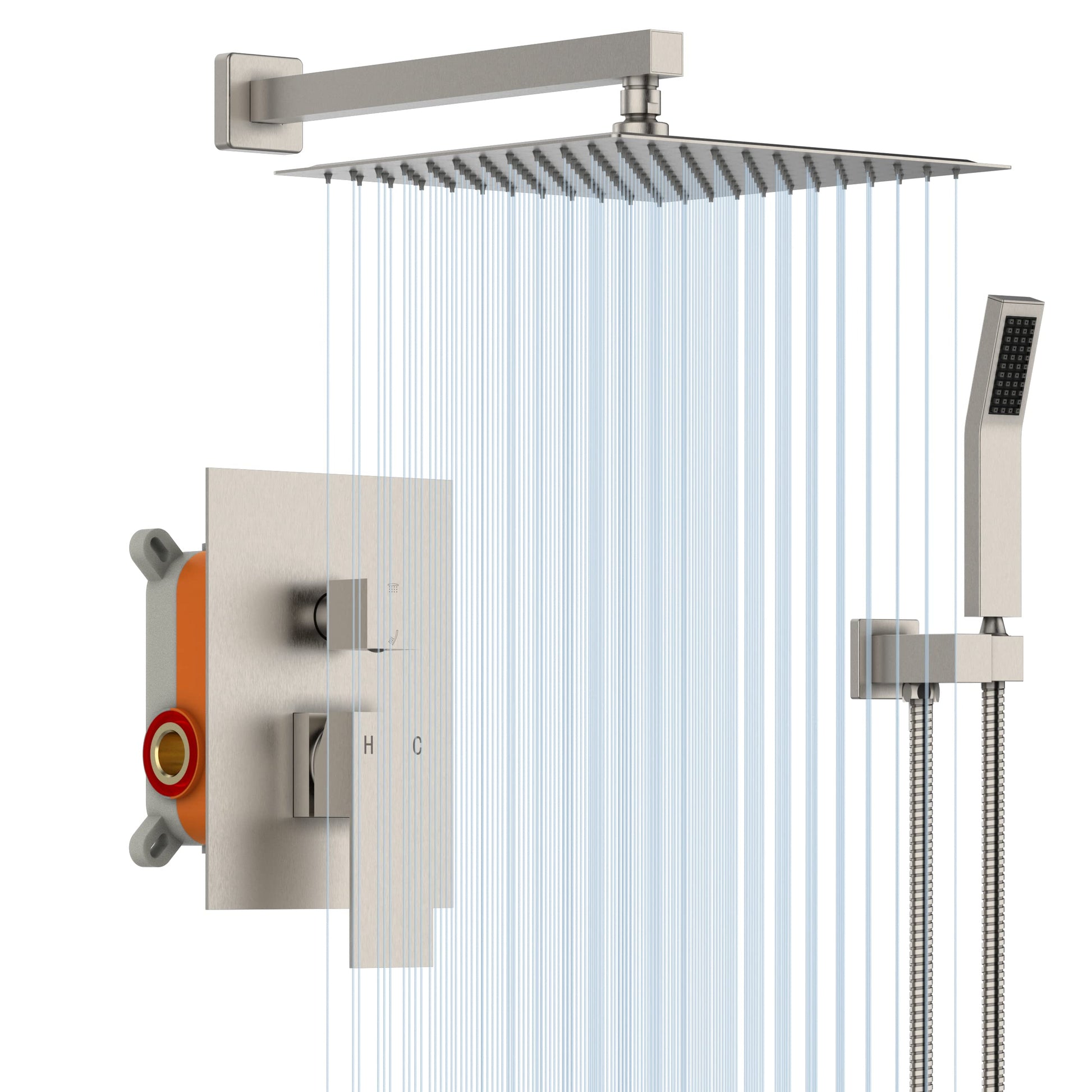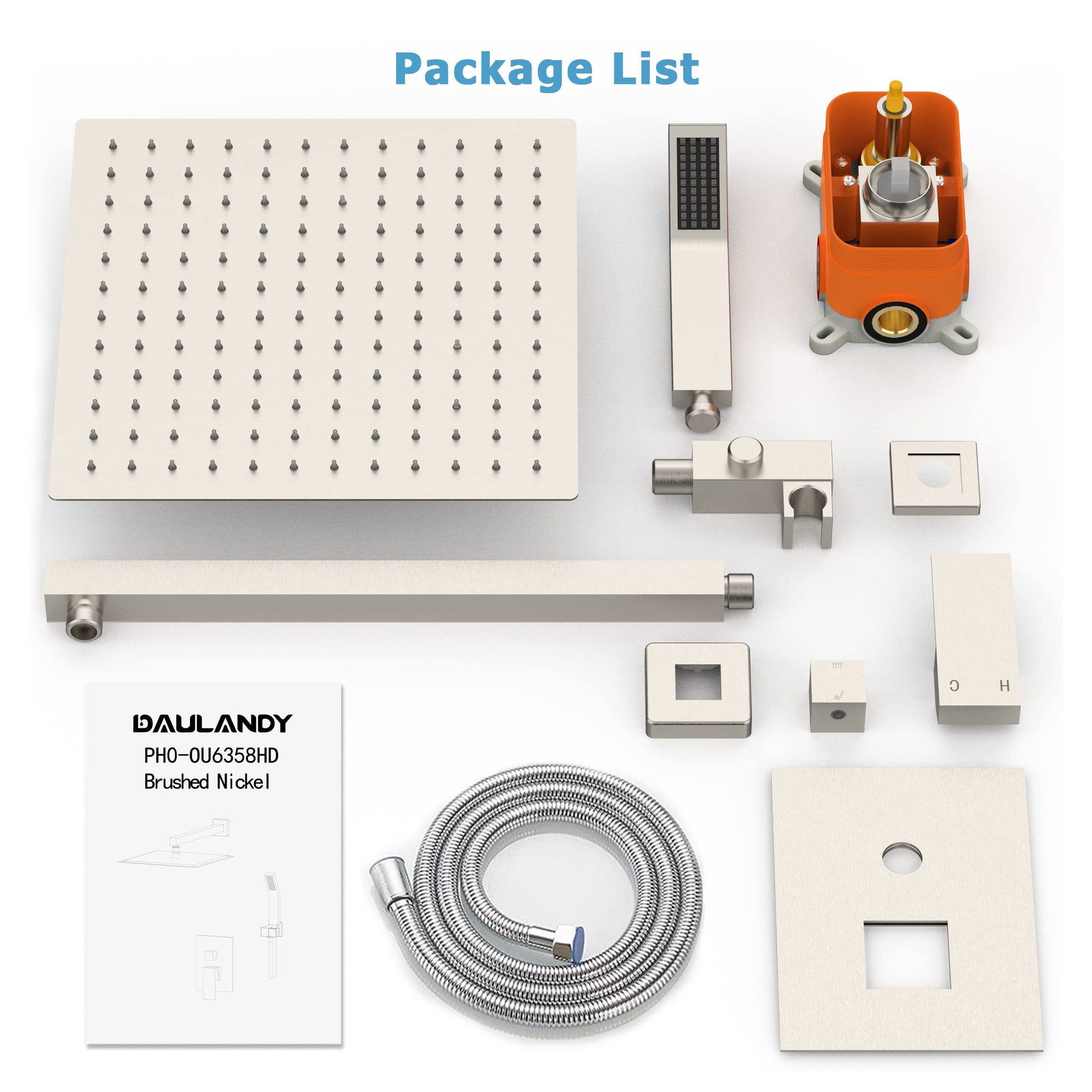 | Package Contents | 12" square SS 1.6mm top spray*1, 400MM square shower arm*1, square shower seat*1, square curved hand shower*1, 1.5M shower pipe*1, square panel*1, pre-embedded box body *1, Square Flange*2, Handle*1, Square Switching Valve Handle*1, Parts Kit*1 (Inner Hexagonal Wrench, Raw Material Tape, Inner Hexagonal Screw*2, Expansion Rubber Column*4, Fixing Screw*4, Red and blue point plug*1, switching valve handle plug*1 |