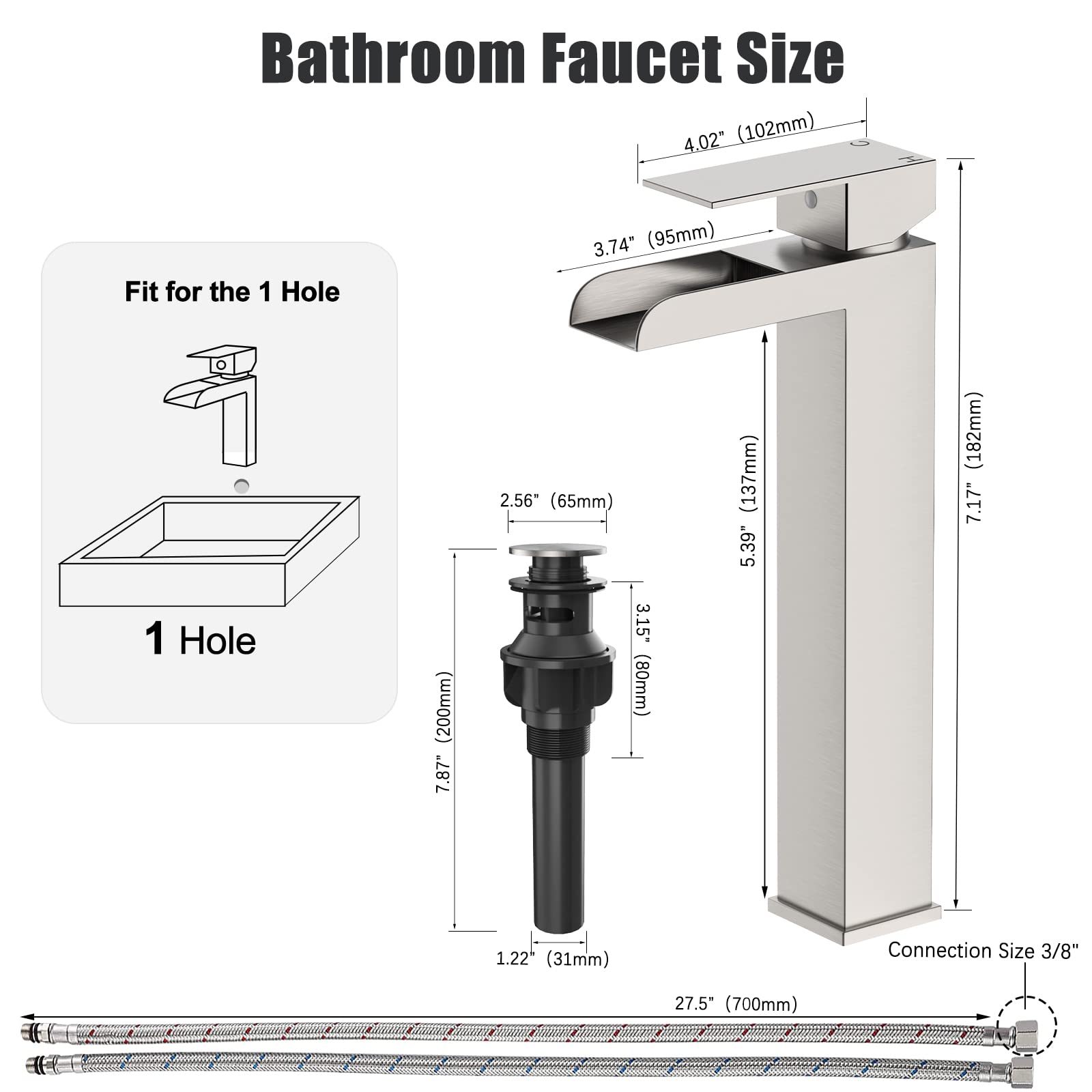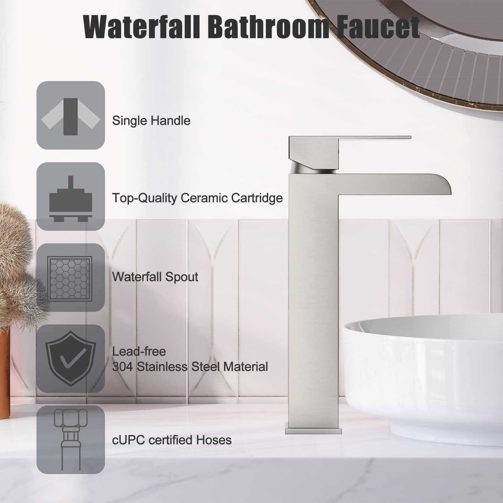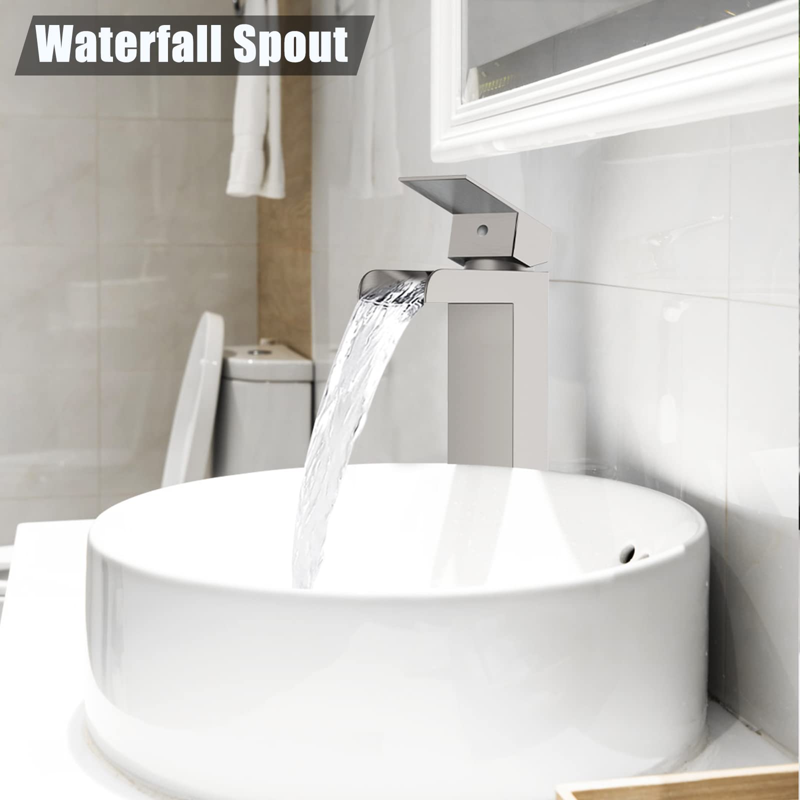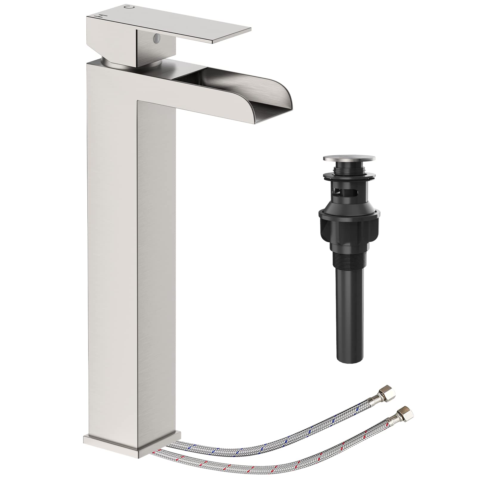GARVEE Brushed Nickel Waterfull Tall Bathroom Sink Faucet for 1 Holes with Pop Up Drain Stopper & Water Supply Hoses No-Lead