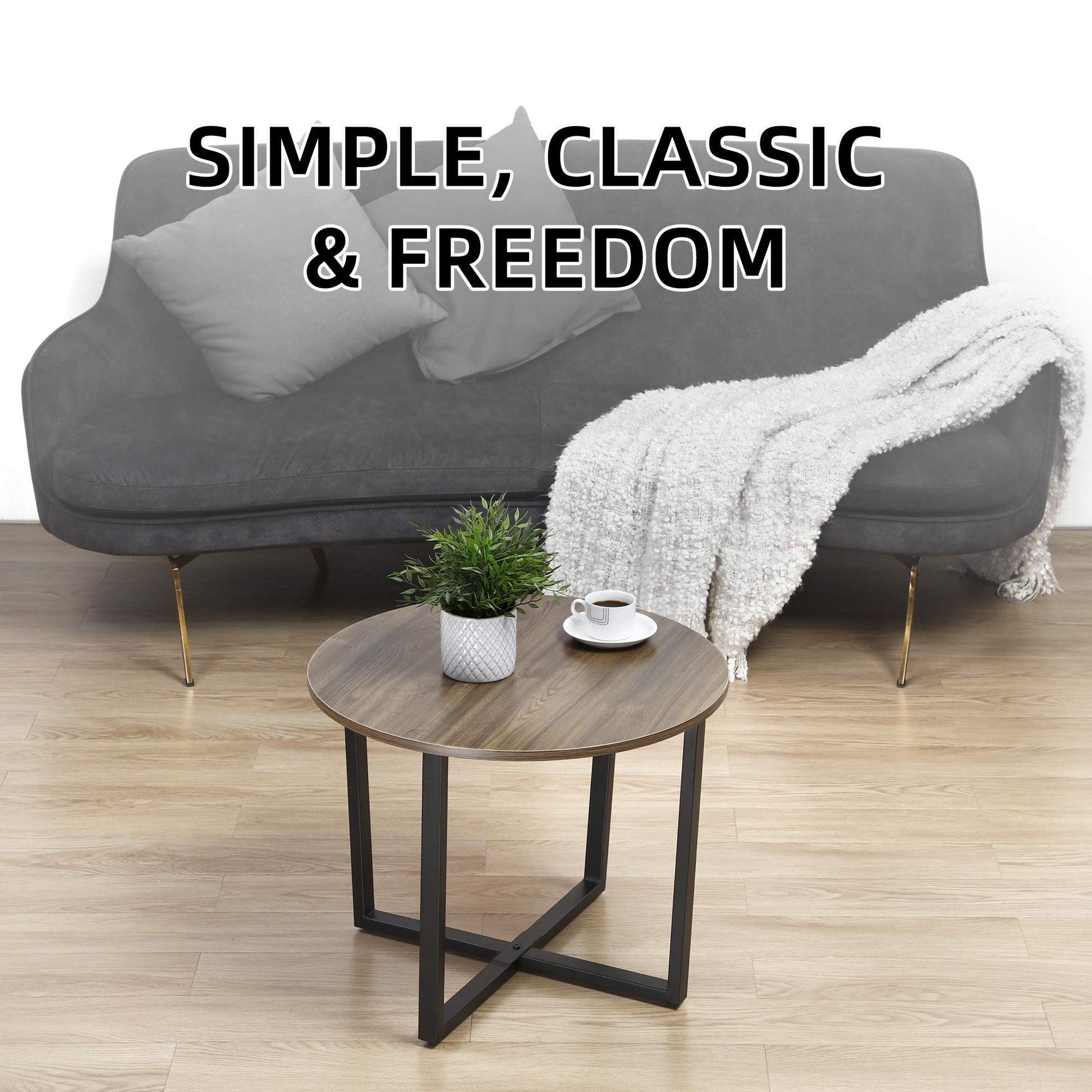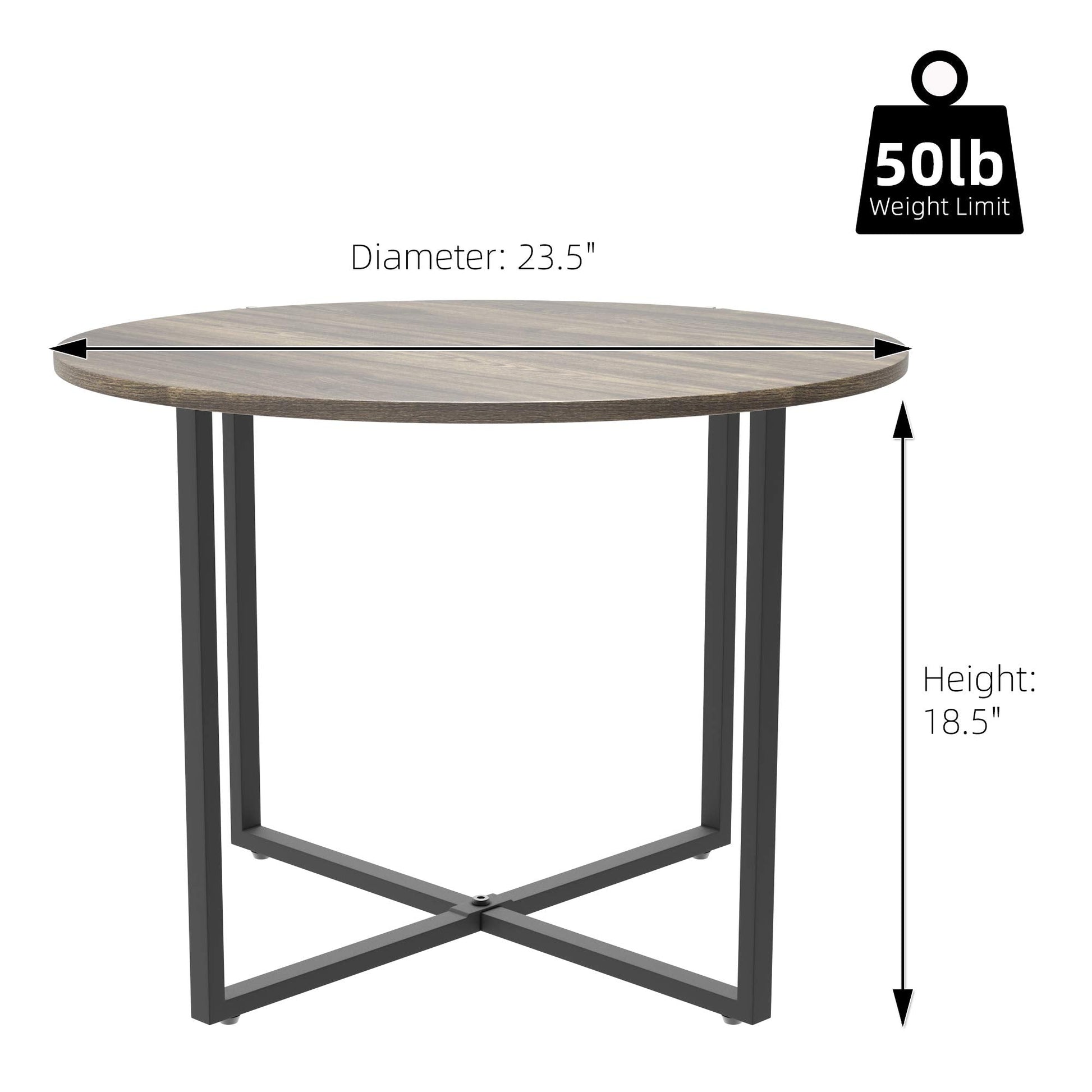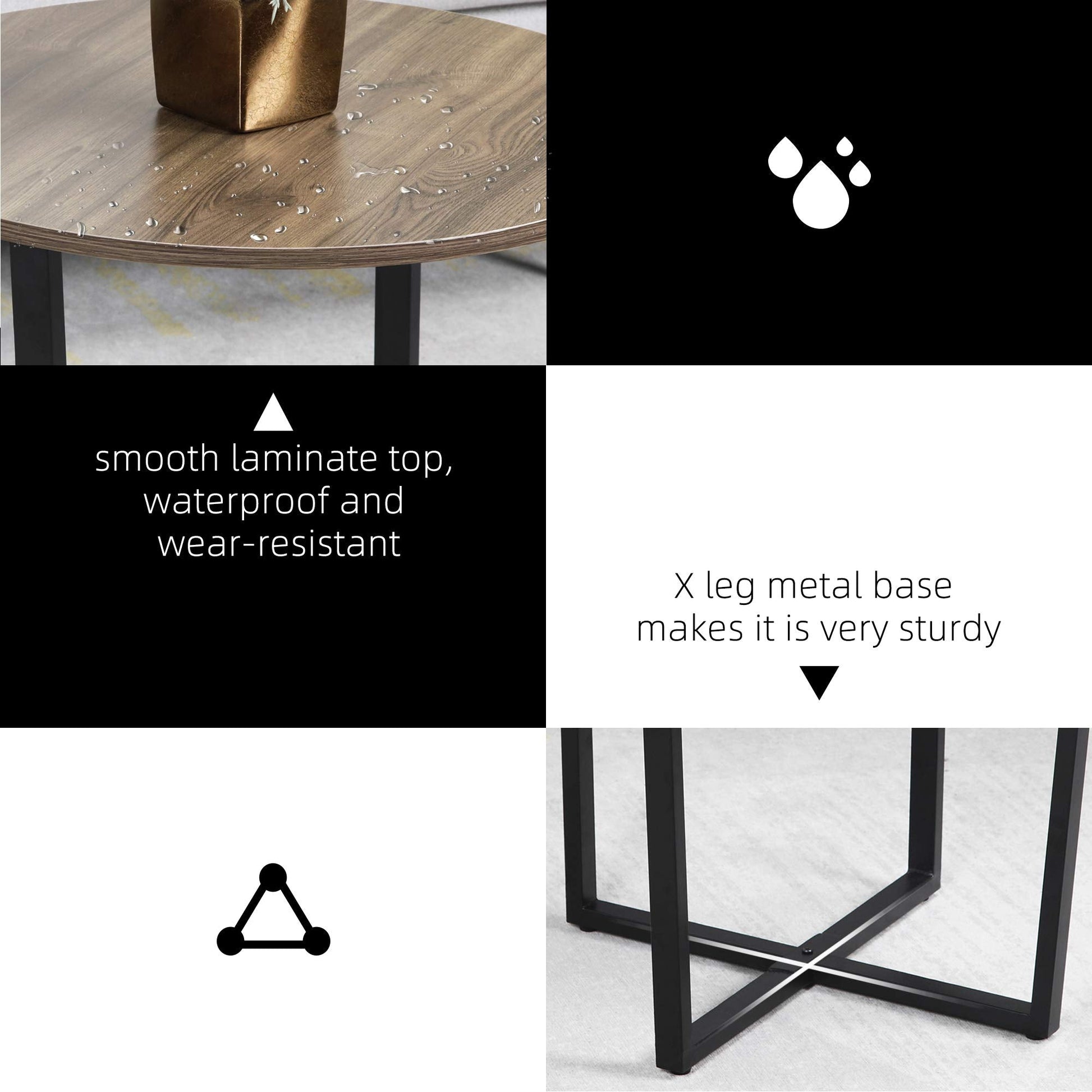 Round coffee table top made of 15mm Eco-friendly P2 particles with perfect edge technology, green non-toxic materials, and waterproof lining. The strong "X" metal frame base ensures durability and stability, resulting in longer use life and never shaking. The table is easy to clean and supports up to 50 Ibs.