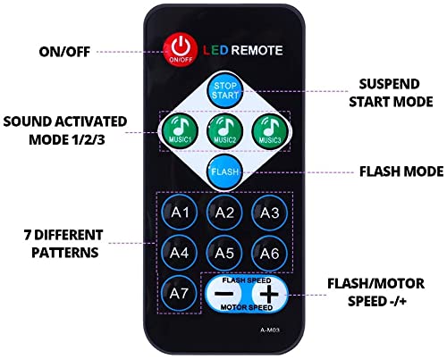 Comes with a remote controller, you can use it to turn on/off the lights, change sound activated/lighting modes and control the rotating/flash speed. All functions on the remote, very easy to use.