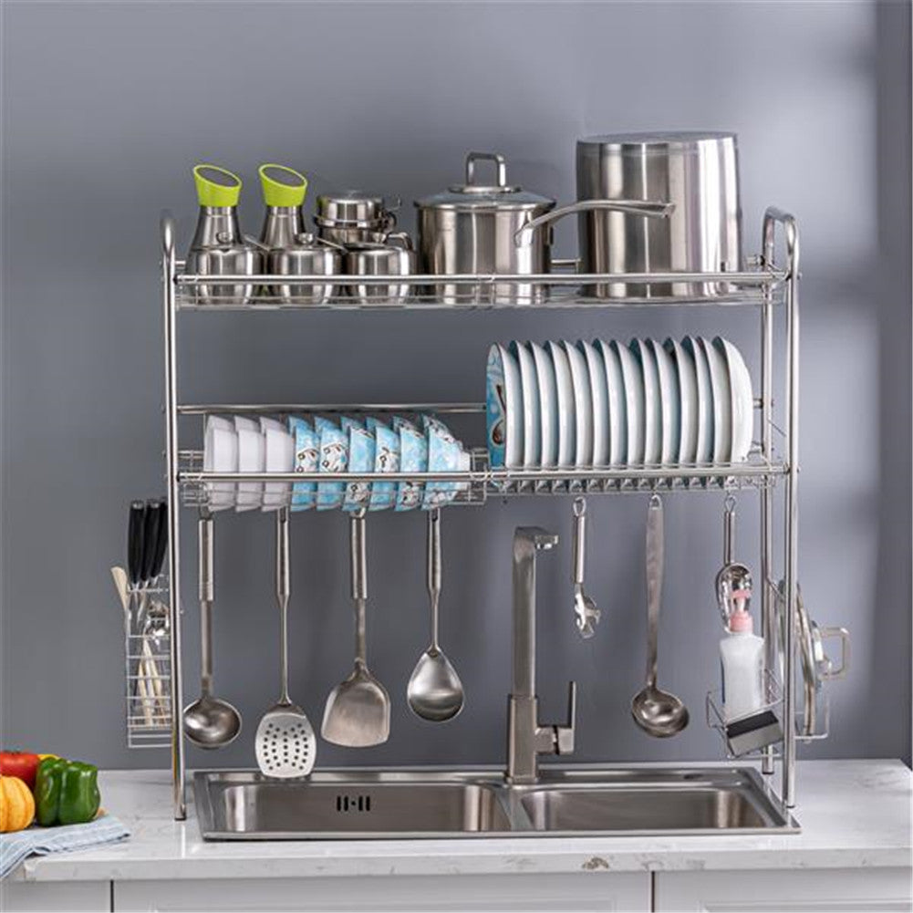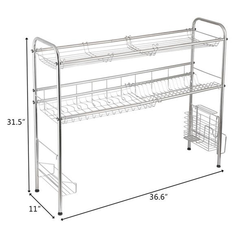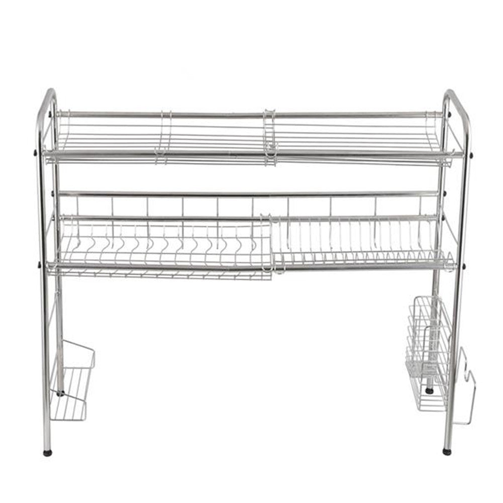 RONSHIN Double Layer Bowl Rack Shelf Dish Drainer 90cm Inner Length Kitchen Organizer Silver