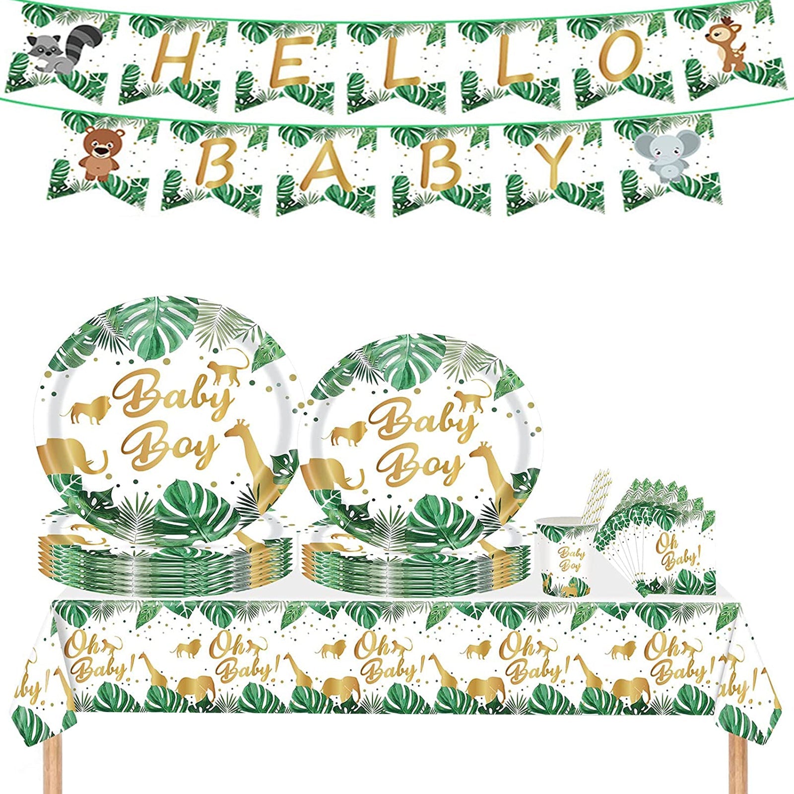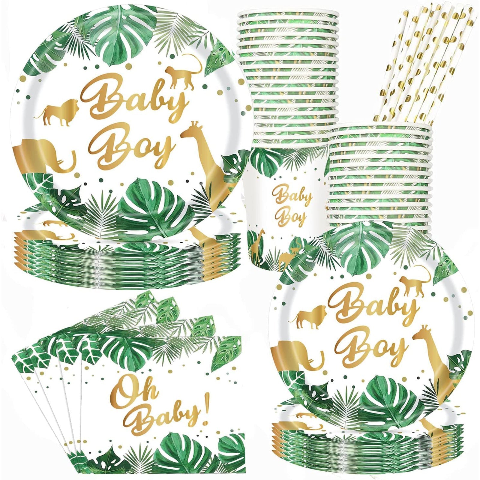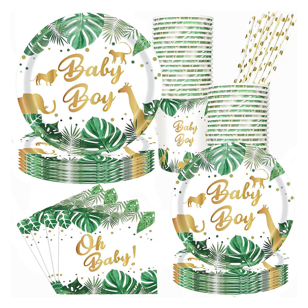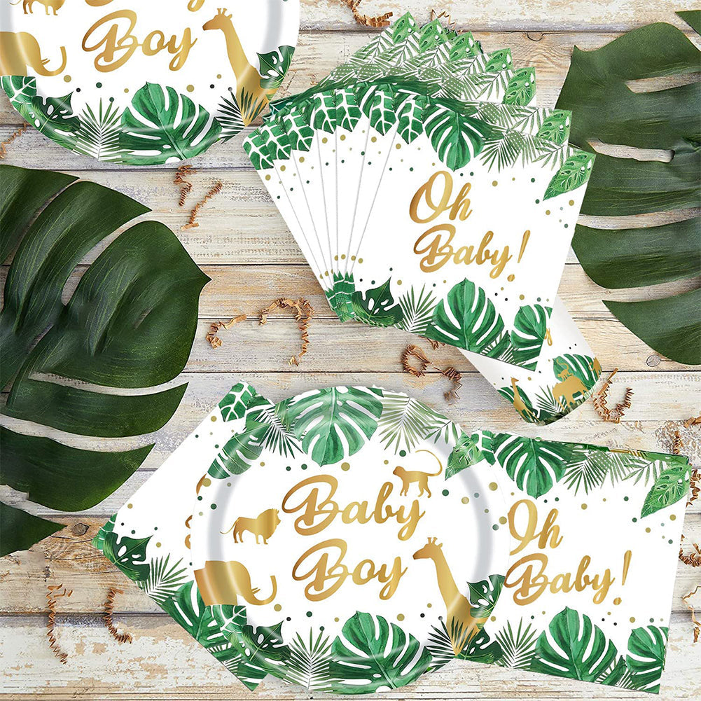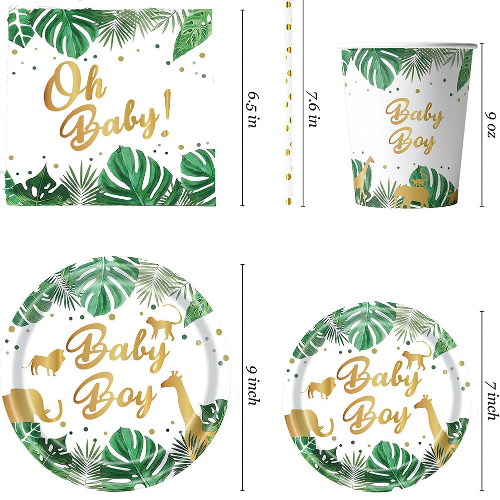 3. Bronzing Animals Designed: This Baby Shower Decorative use animals giraffes, leaf background and elephants and other animals jungle theme design, The plates printed with the gold foil word "Baby Boy", bring a high-end and Vibrant atmosphere to your party Many jungle elements on paper cups, dinner plates, and napkins, such as woodland animal creatures and "wild animals". The party set really adds dimension to your parties as your guests will love the cute and fun design.